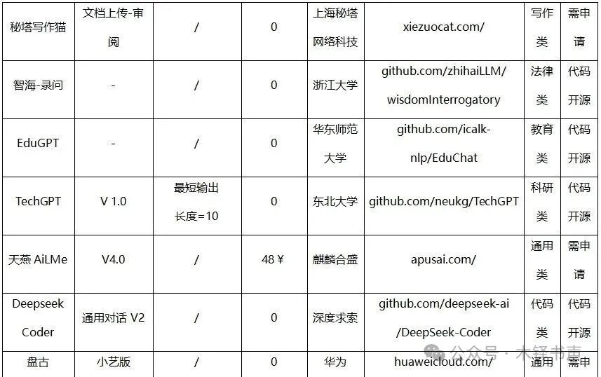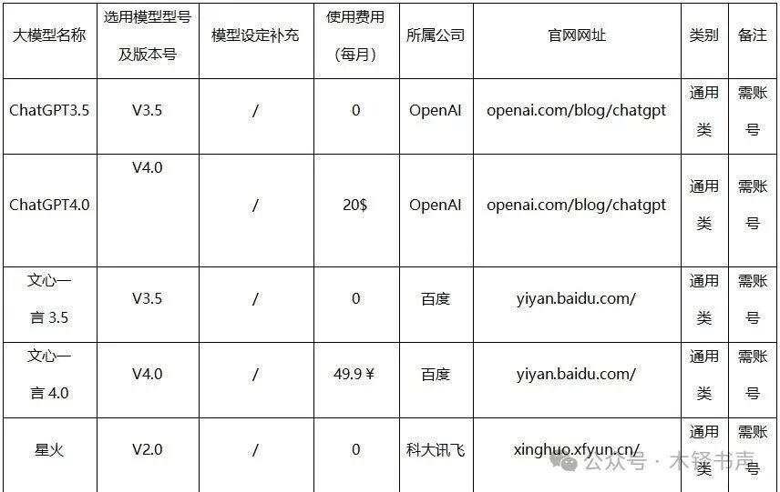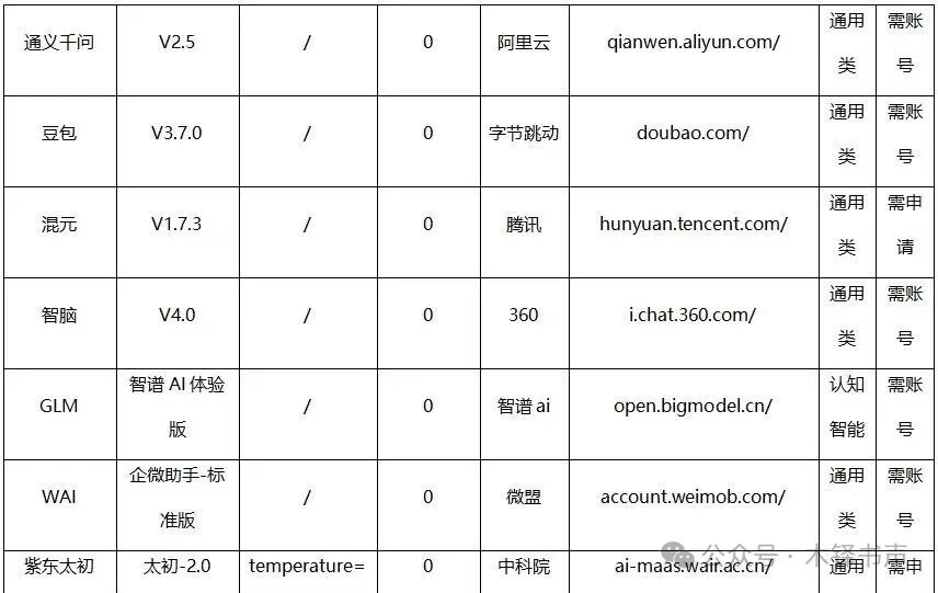 表 实例测试的大模型名单信息