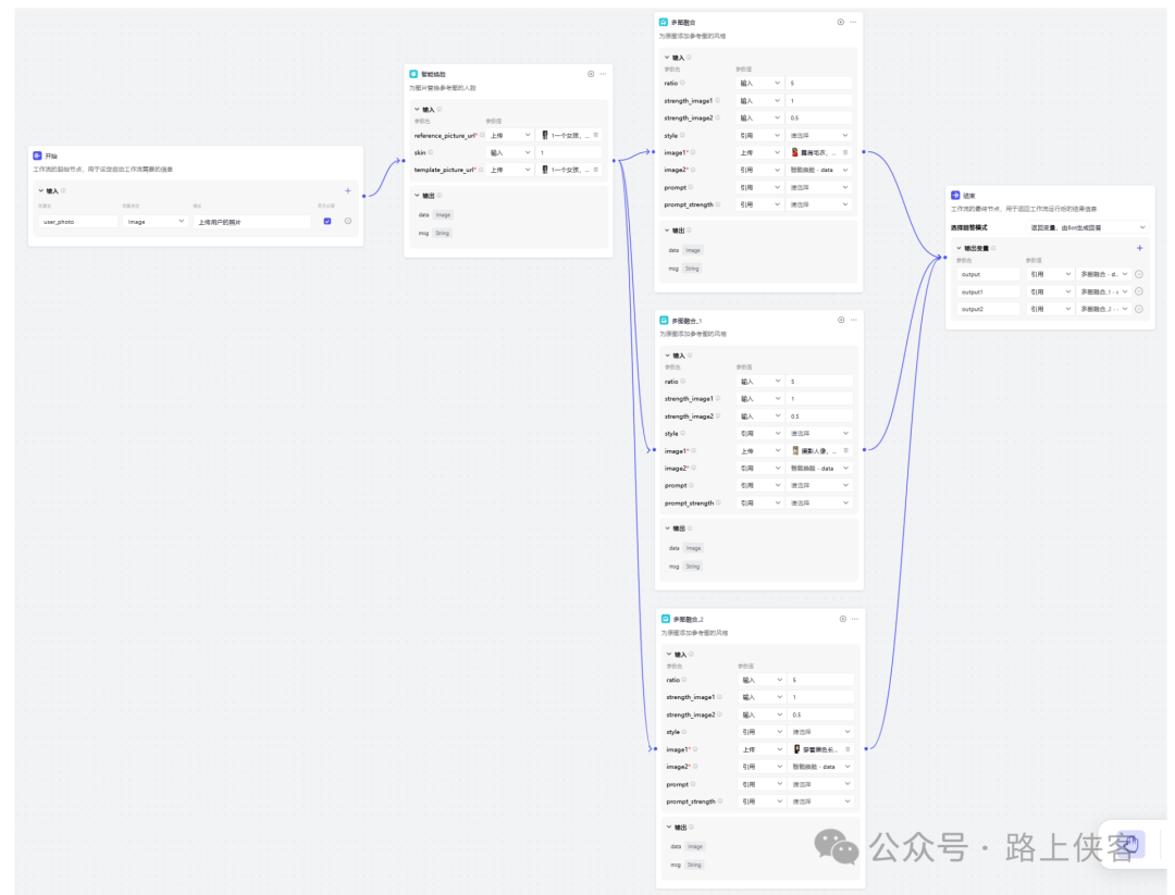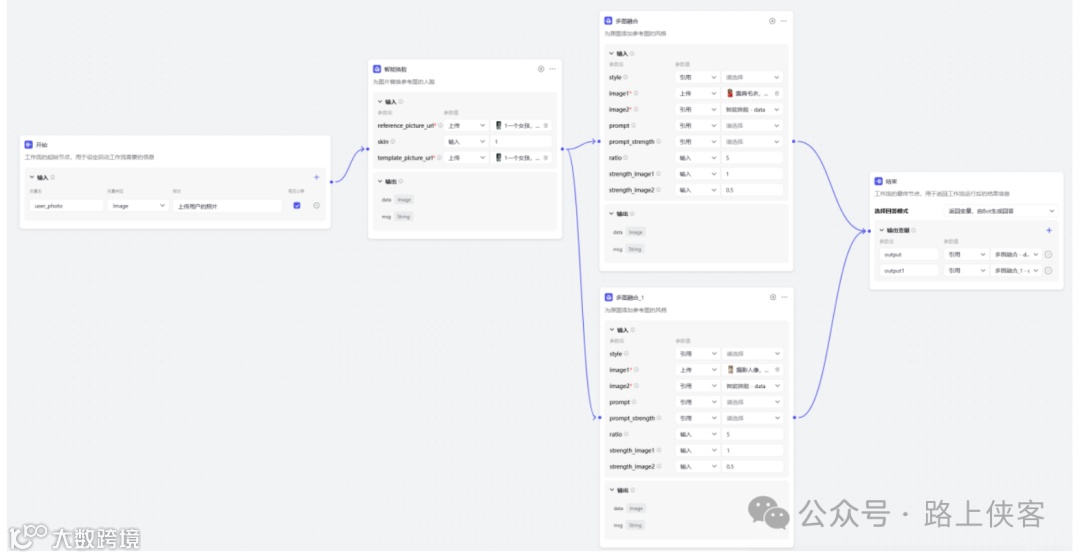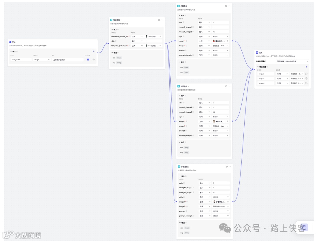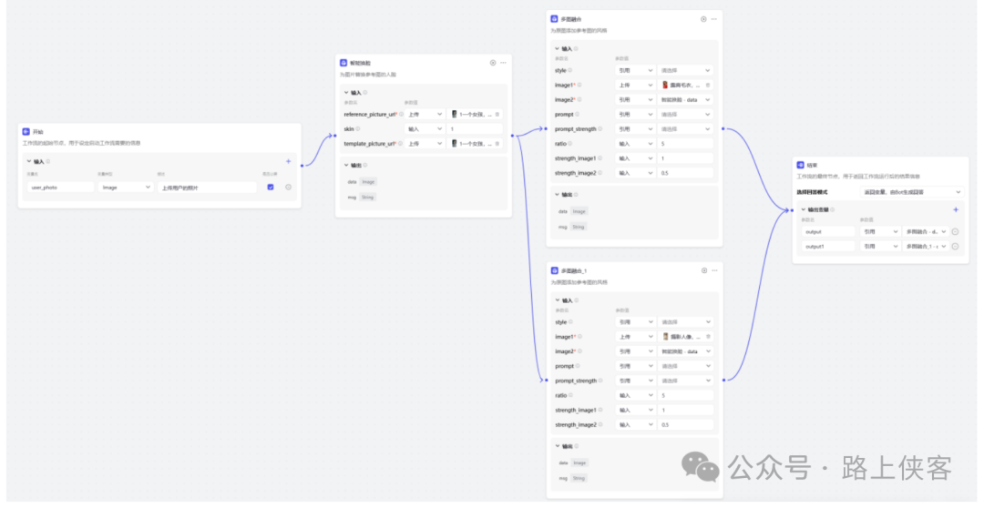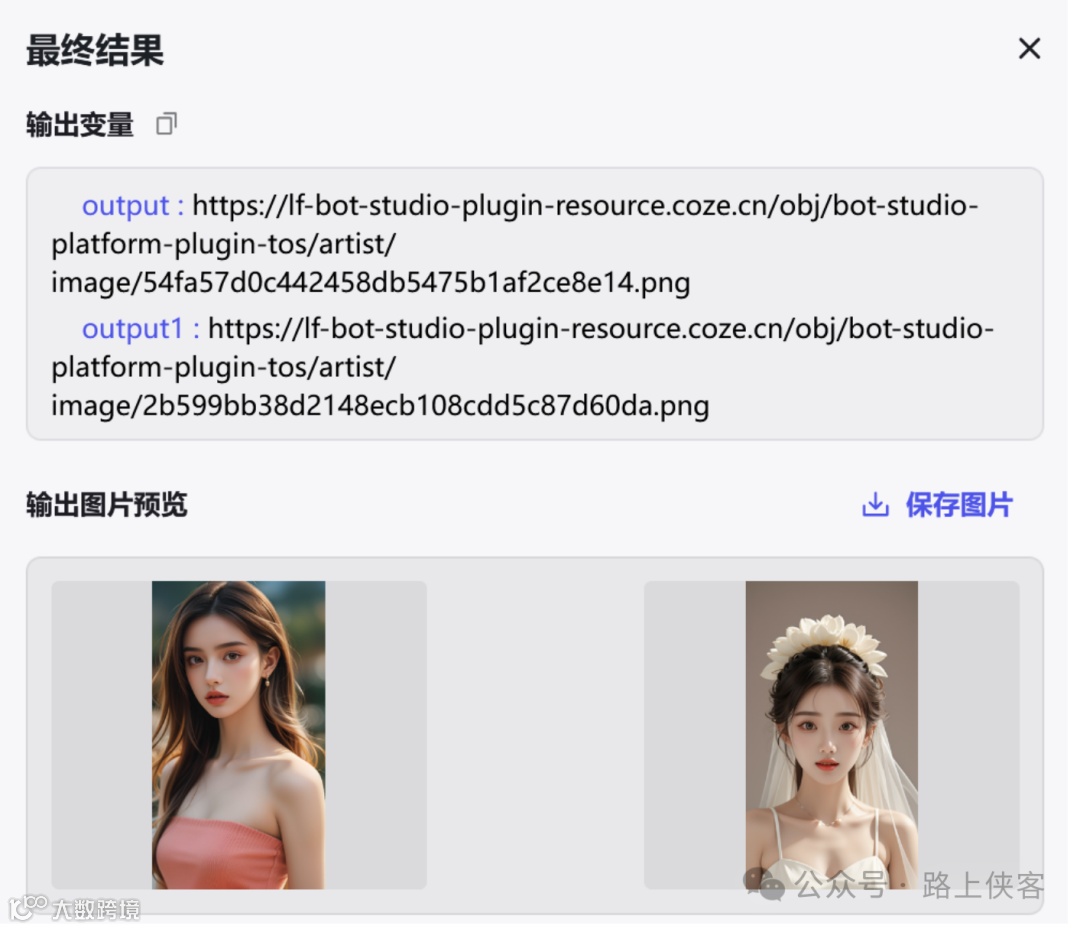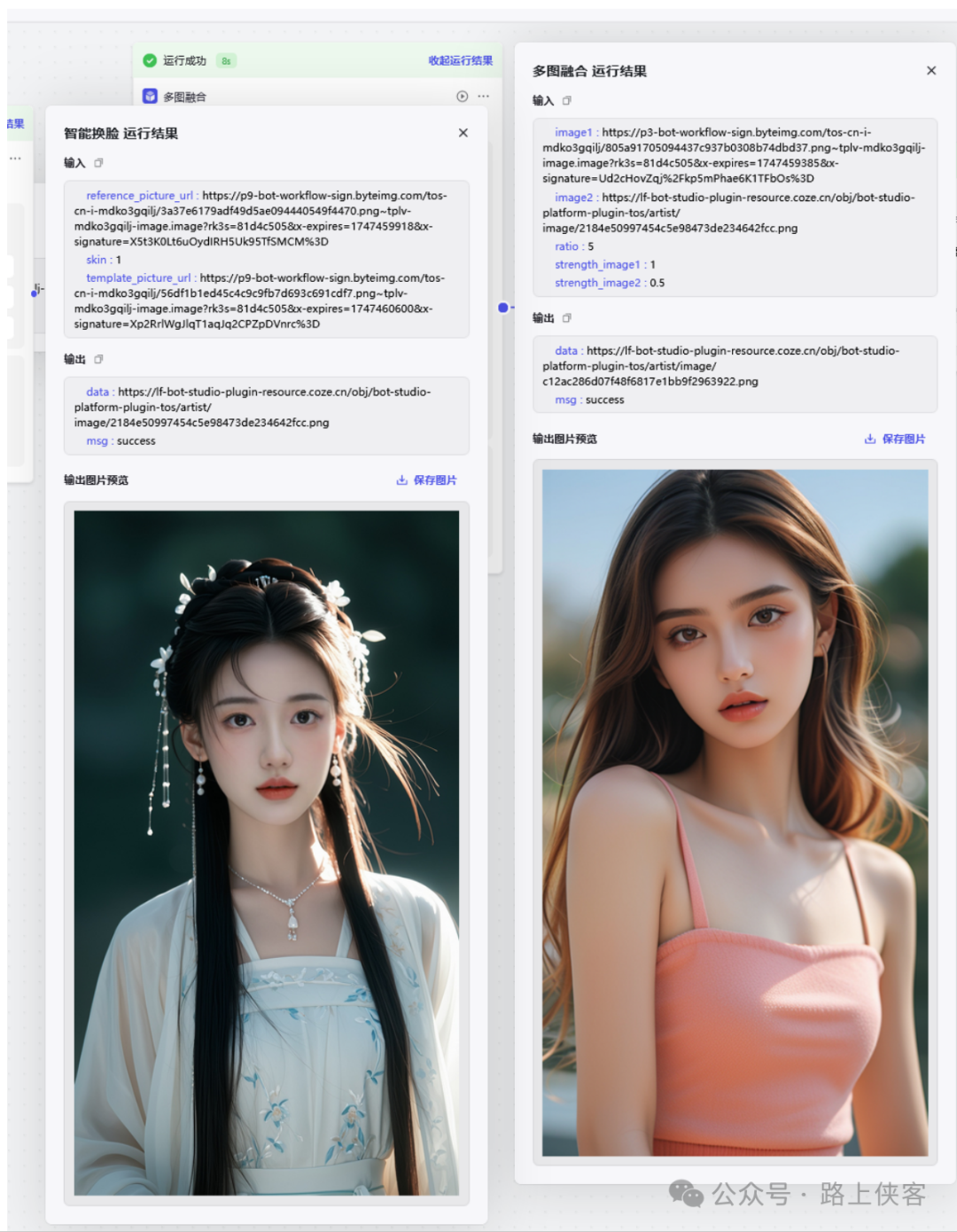 最后可以同时生成两张写真图片,当然如果需要同时生成更多的,那么可以再去对上面的多图融合节点进行复制变更即可。