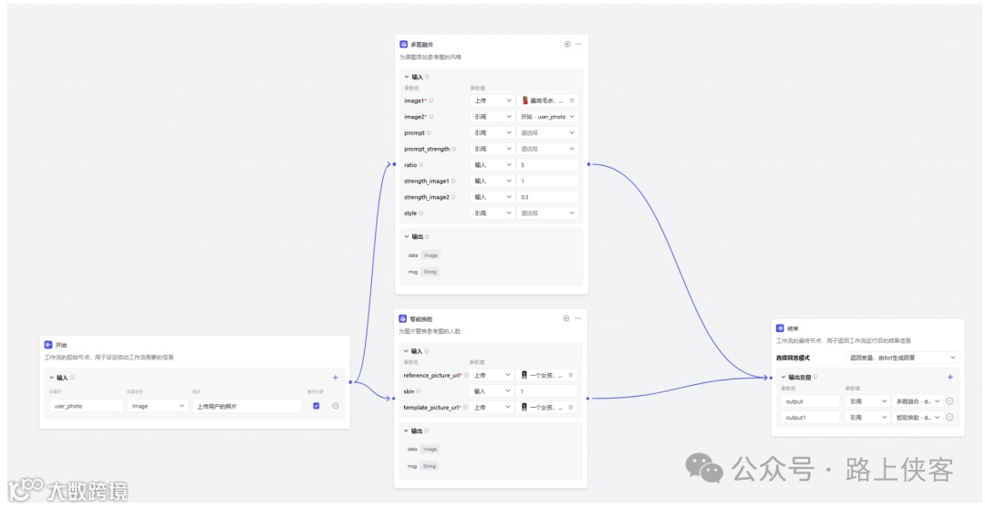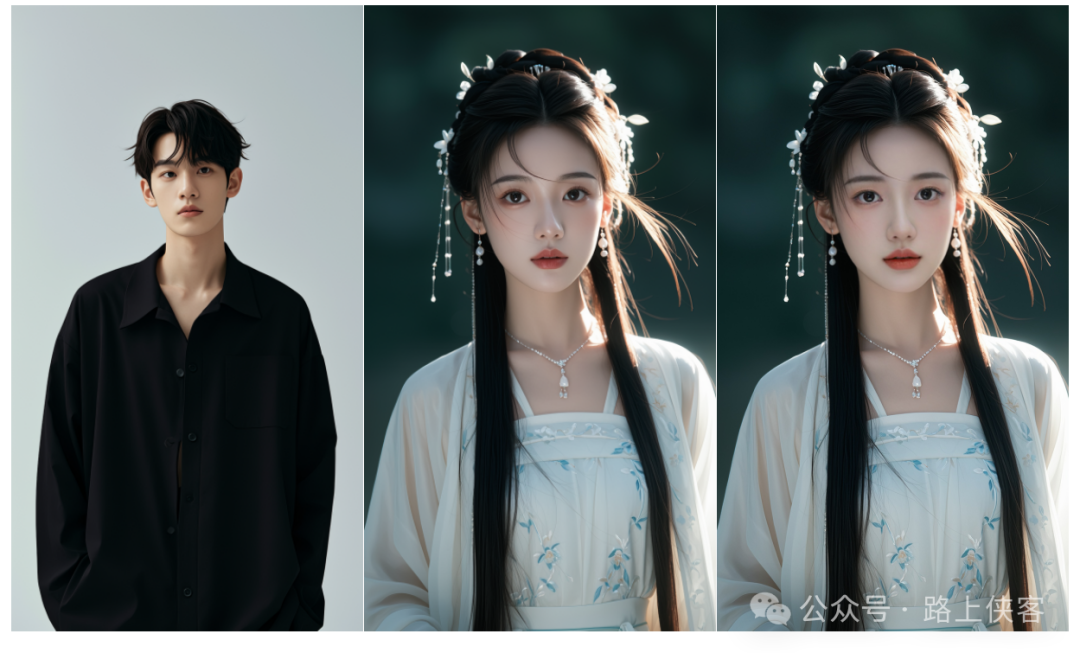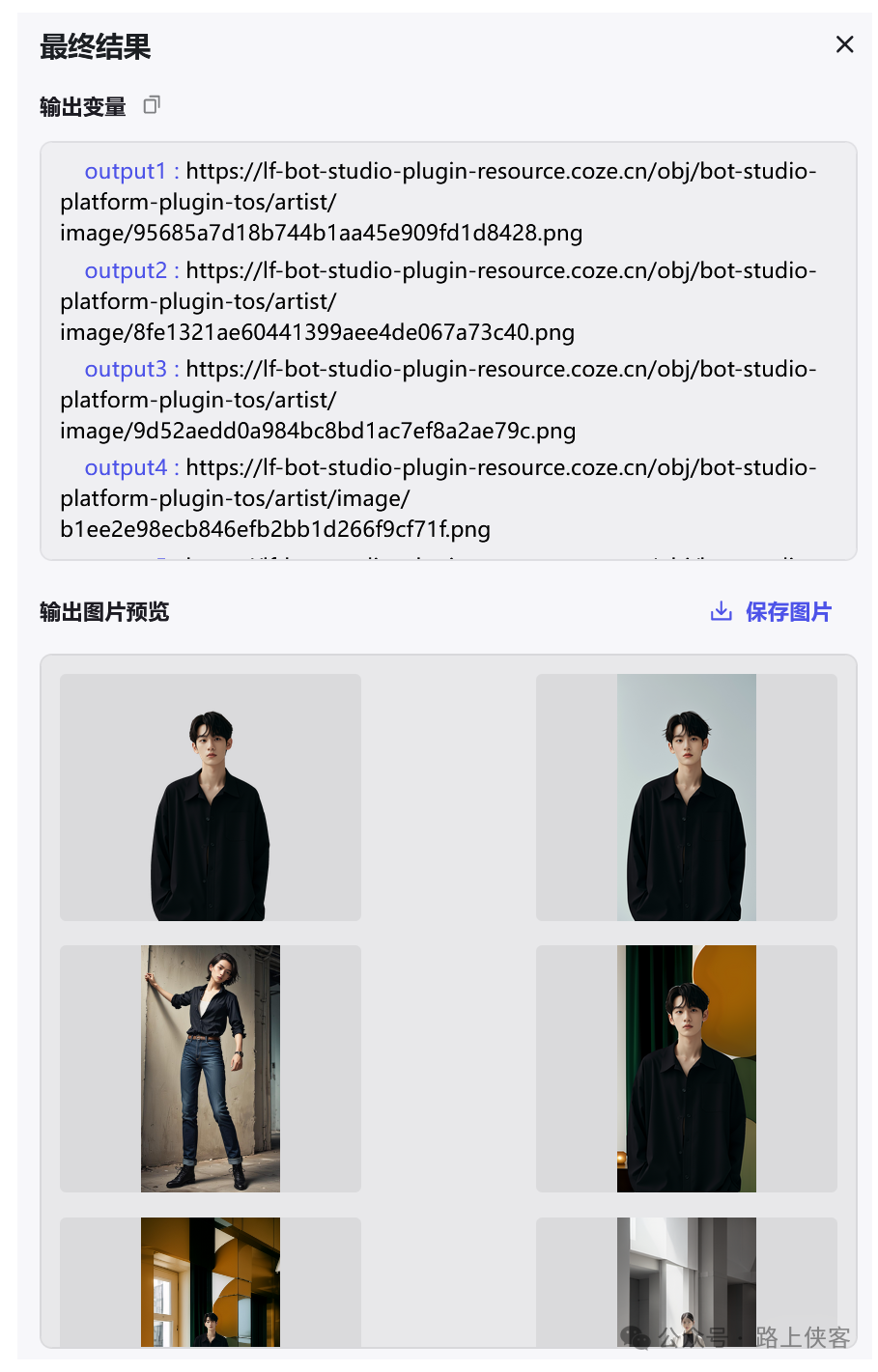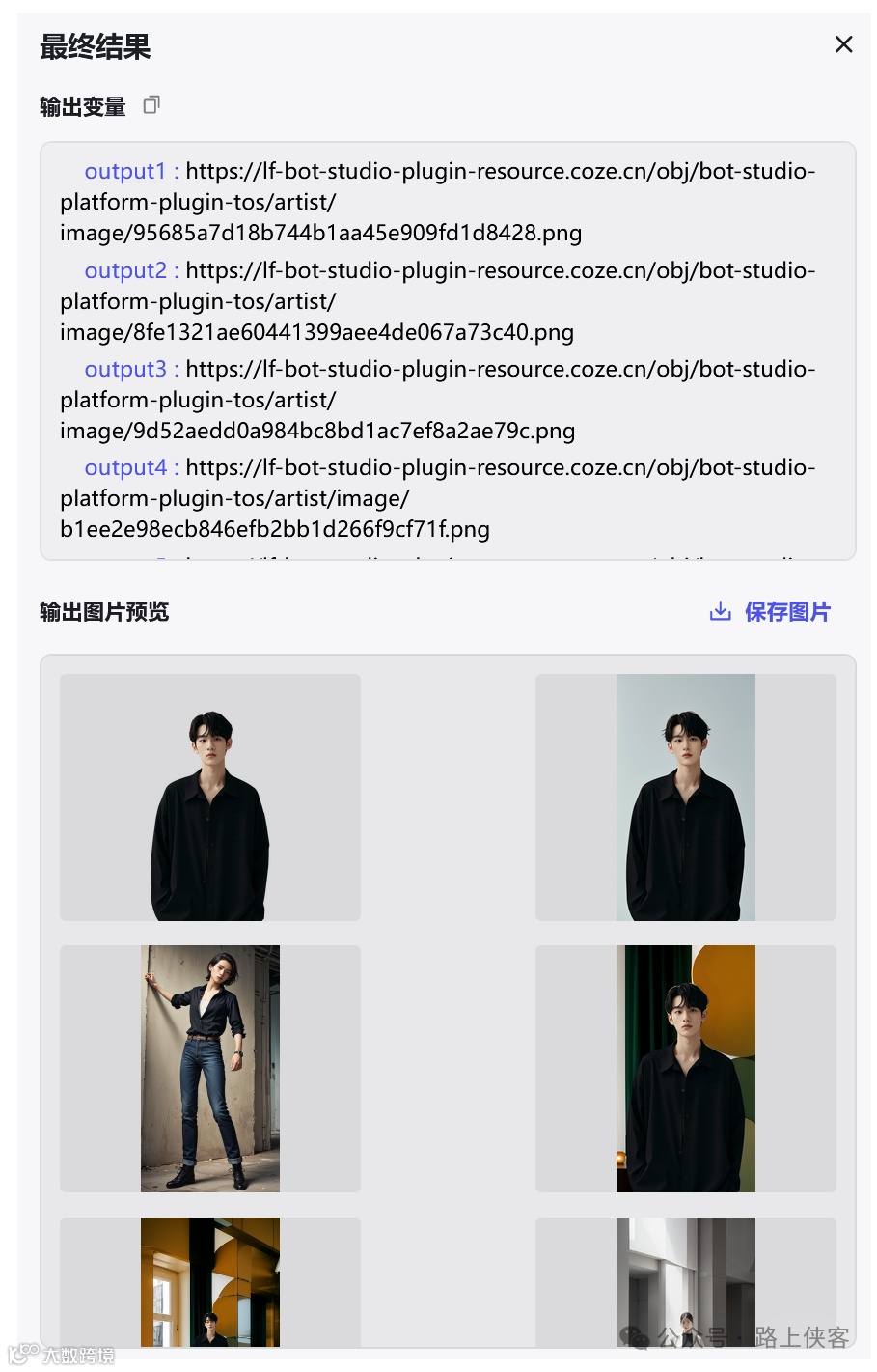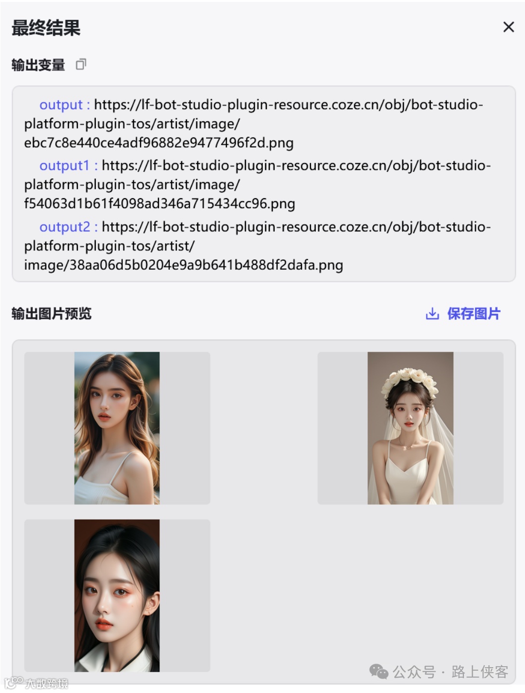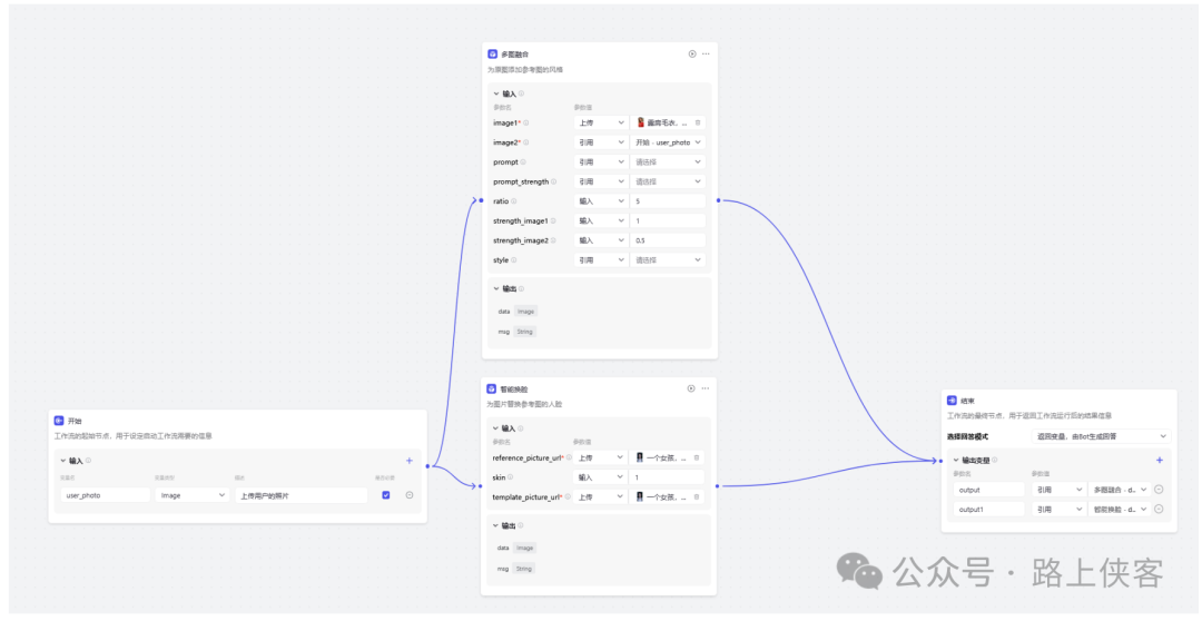 最后可以同时生成两张写真图片,当然如果需要同时生成更多的,那么可以再去对上面的多图融合节点进行复制变更即可。