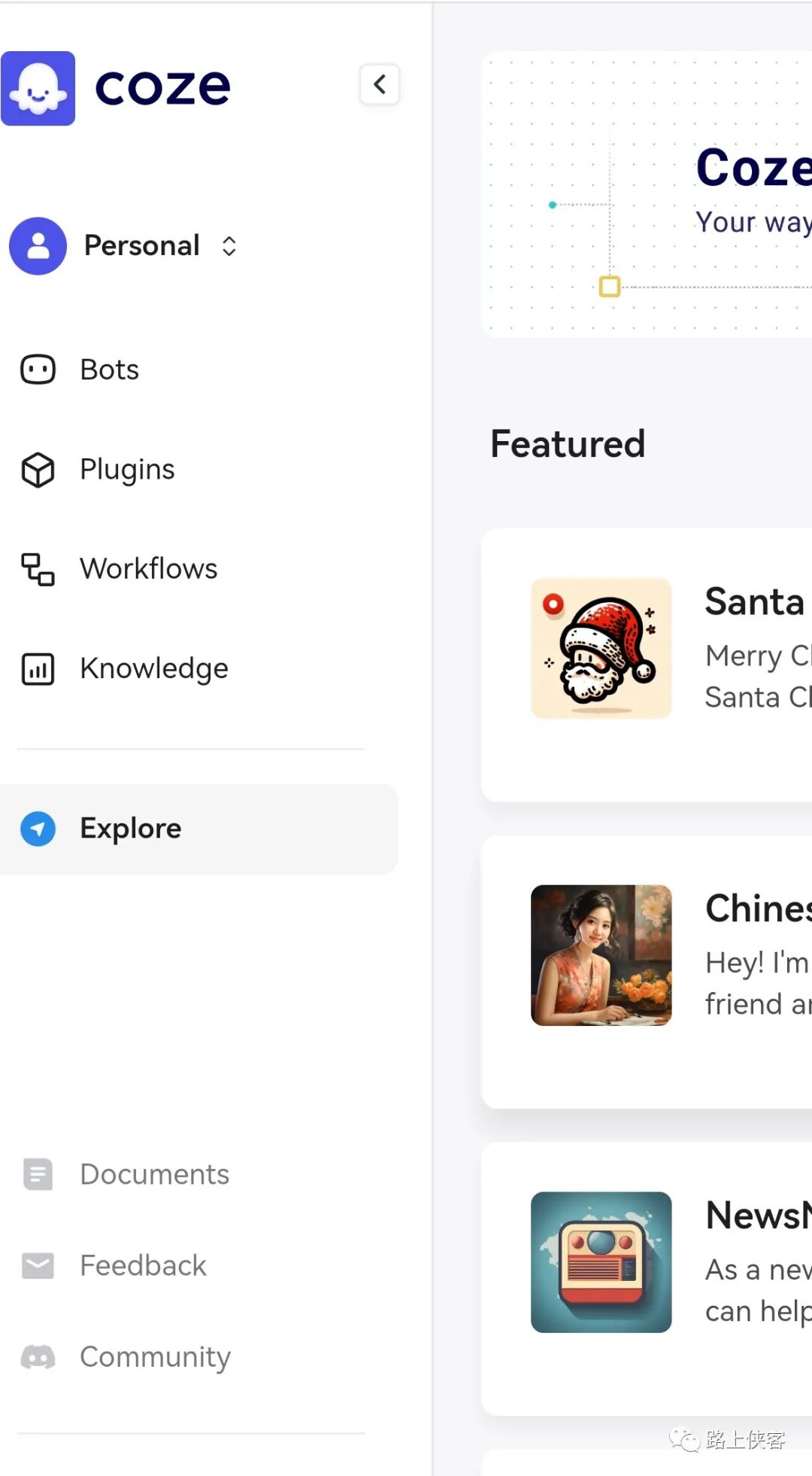 Coze平台,这是一个专为开发下一代AI聊天机器人而设计的应用编辑平台。Coze允许用户轻松创建各种类型的聊天机器人,并将其部署在不同的社交平台和消息应用上。无论您是否具备编程经验,都可以使用Coze实现您的AI聊天机器人想法。