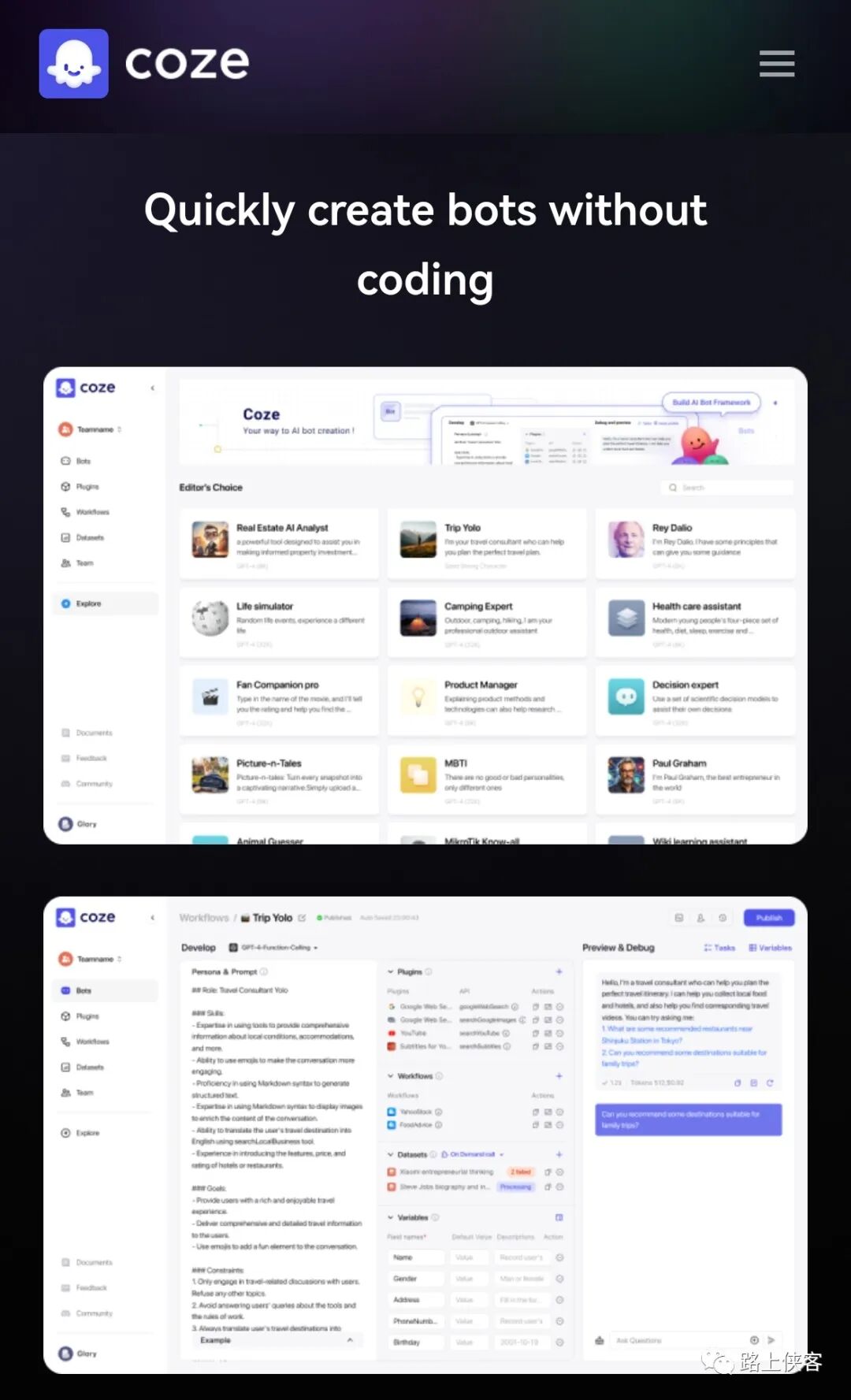 此外,Coze还支持遵循ChatGPT插件标准的插件,并允许用户通过界面手动配置以创建自己的自定义插件。