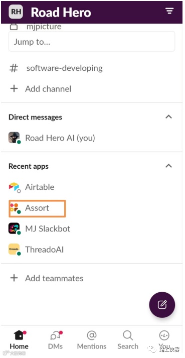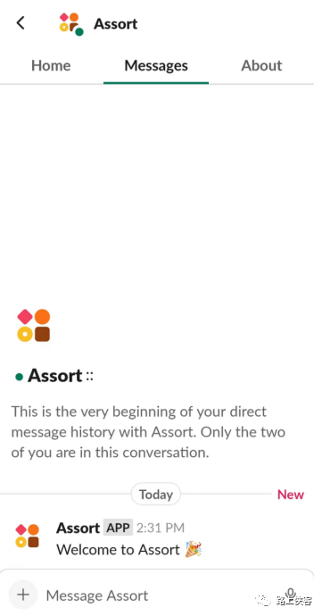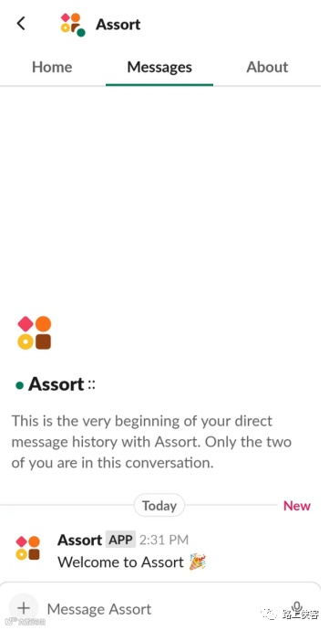 然后,我们打开Slack APP。我这边以手机端应用为例。授权加载完Assort你可以看到在你的Slack应用中已多了一个应用。