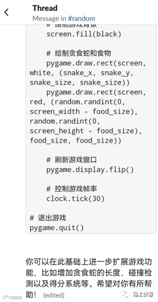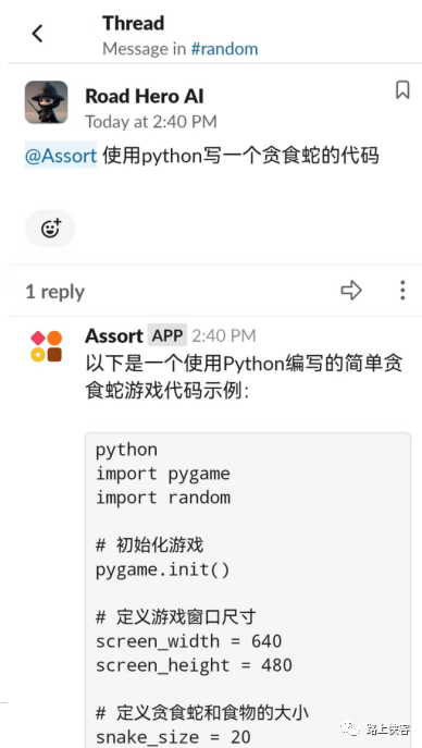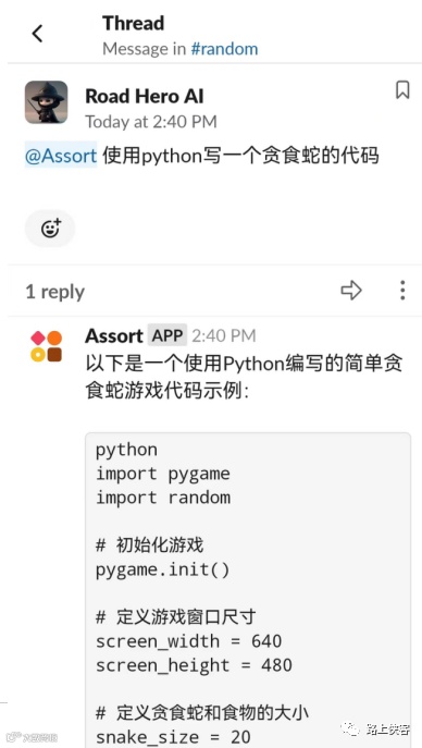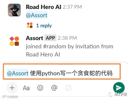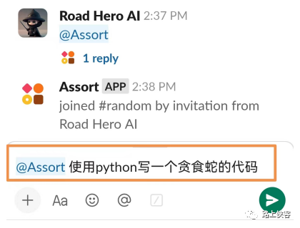 下面我们可以让ChatGPT工作了,我们先让它写个贪食蛇的Python程序。记得在输入框前一定要要加上@Assort前缀,然后再编辑你徐璈的Prompt语句。