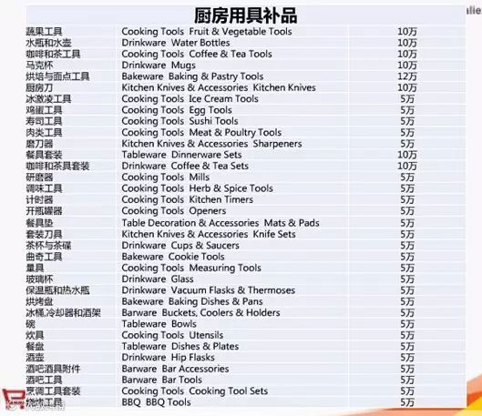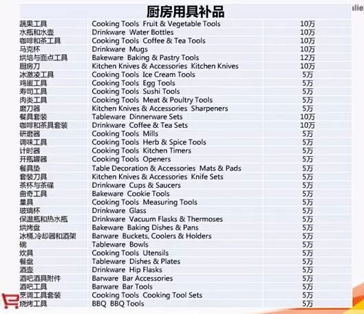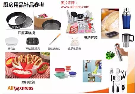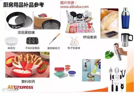 厨房用品品类差异性不大,以烘焙、烹饪工具为主;吸引人的是色彩感强,功能性强的产品。厨房补品这块,活底蛋糕模烘焙套装,裱花台,塑料收纳等都是好的参考。