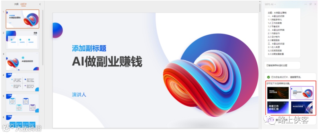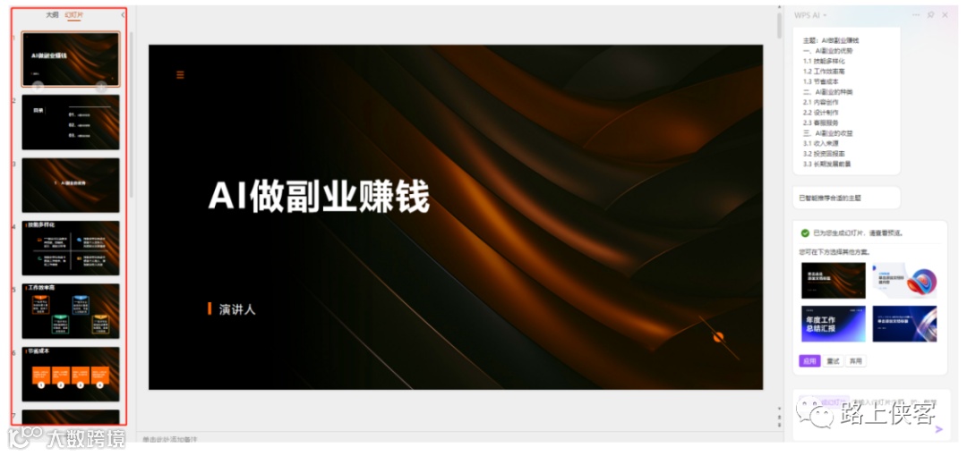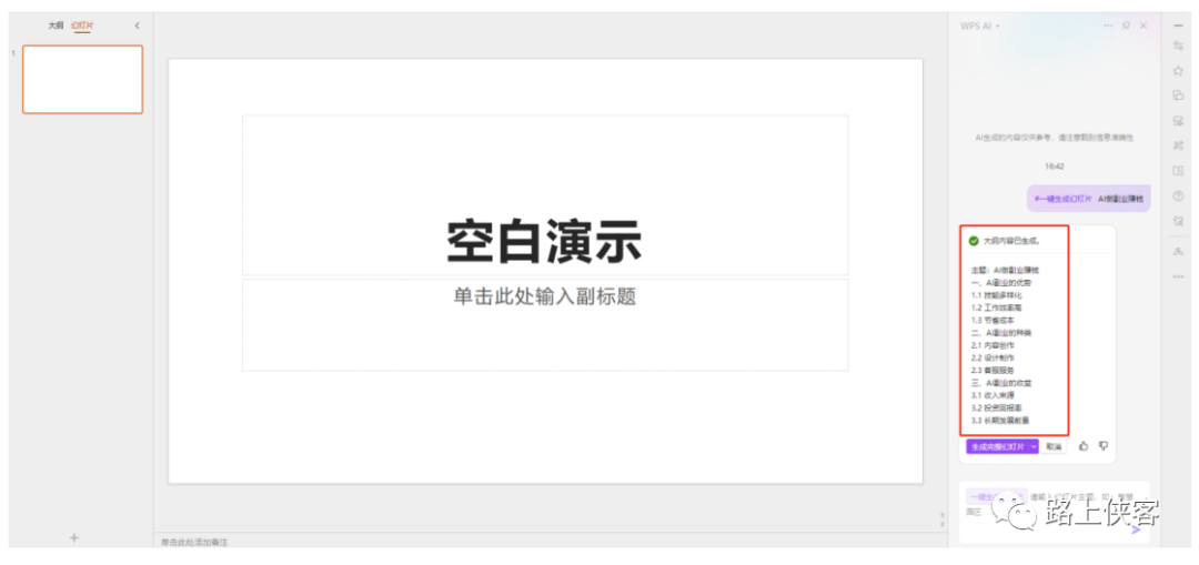 我们最后看下PPT的WPS AI制作。给到一个主题WPS AI会先给你罗列出一个PPT大纲。
