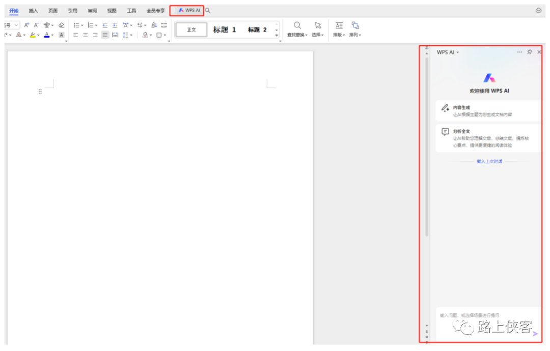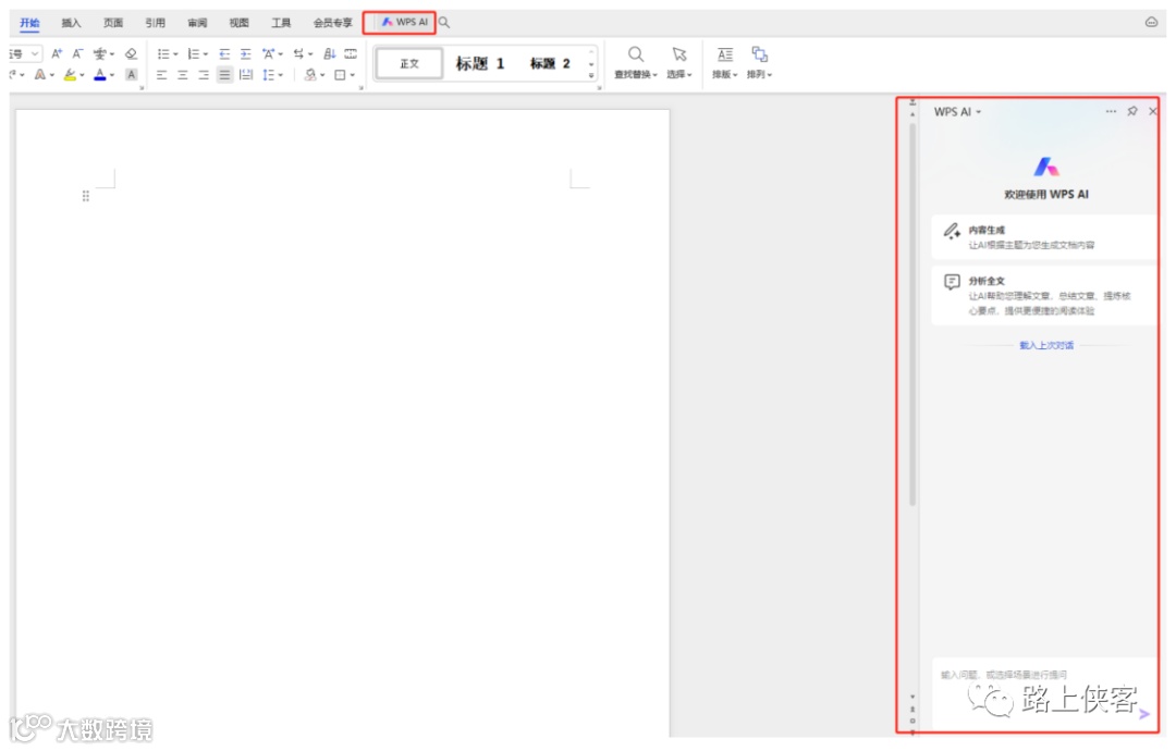 先来体验下WPS AI,在申请试用后,在你的WPS电脑端打开WPS Office后在置顶位置的菜单栏最后有一个醒目的WPS AI图标,点击后会弹出右边的AI侧边栏对话框。