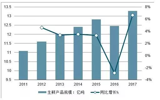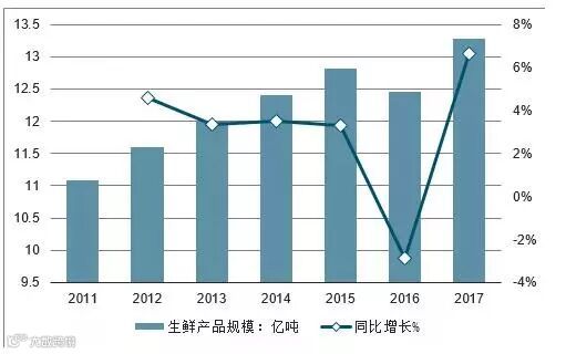 2011-2017年我国生鲜产品规模(单位:亿吨,%)