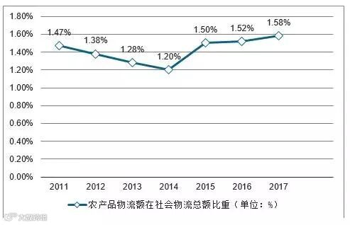 首先,我国物流行业起步较晚,对于农产品的物流认识存在不足,导致农产品物流在整个物流领域中比重不大。2017年我国农产品物流总额达到4万亿元,而同期社会物流总额达到252.8万亿元,占比仅有1.58%,还有很大提升空间。