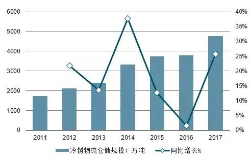 2011-2017年我国冷链物流仓储规模(单位:万吨,%)