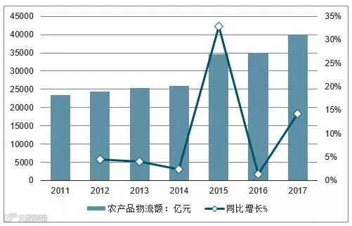 2011-2017年我国农产品物流额及增长变化(单位:亿元,%)