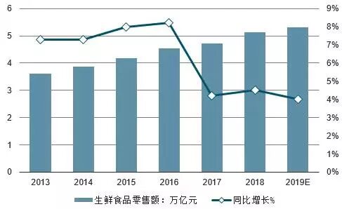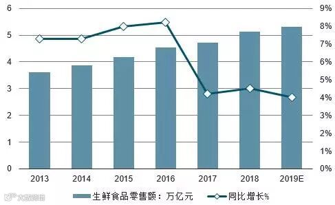 2013-2017年中国生鲜食品零售额从3.61万亿元增长到4.72万亿元。预计2019年中国生鲜市场交易规模将达到5.31亿元。