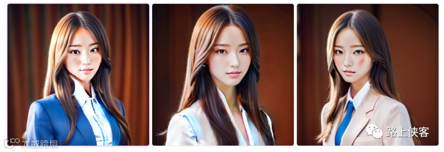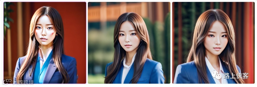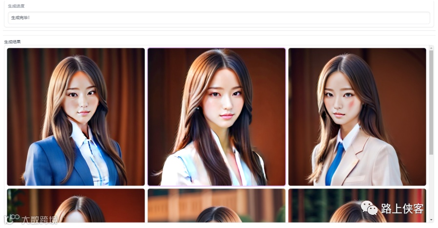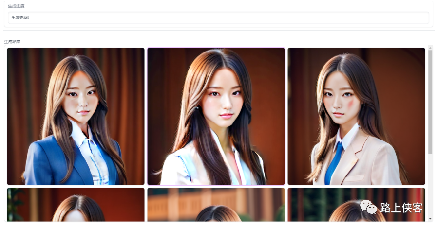 共生成了6张商务正装风格的图片。整体效果还是不错的,唯一的瑕疵是其中第1,3,4张的图片两侧脸颊的腮红是不是过猛了些。