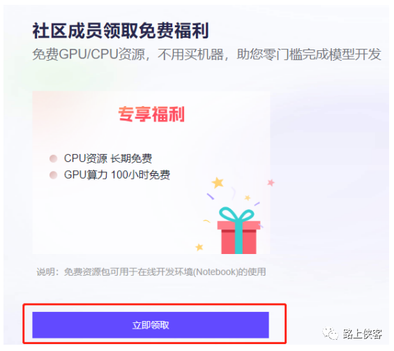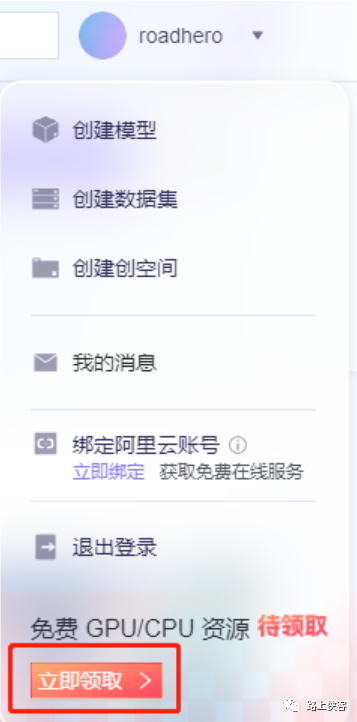 最后可以领取下免费GPU、CPU资源,右上角点击你的账户头像下拉菜单中点击立即领取按钮。