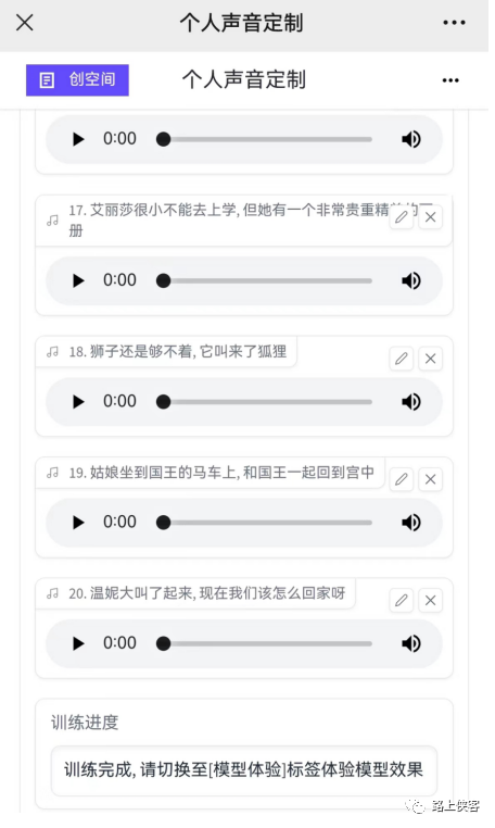 我这边电脑没有麦克风所以通过手机端进行了训练。我按照它的声音文案朗读了20条,训练时长在3-5分钟。