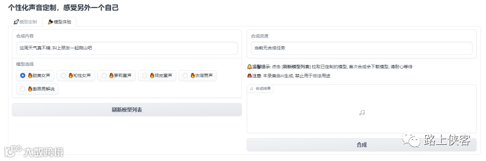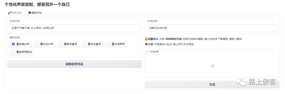 然后训练完了直接可以在置顶的模型体验标签页进入合成即可。