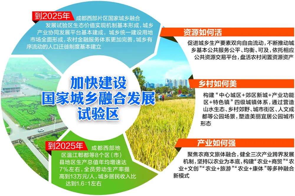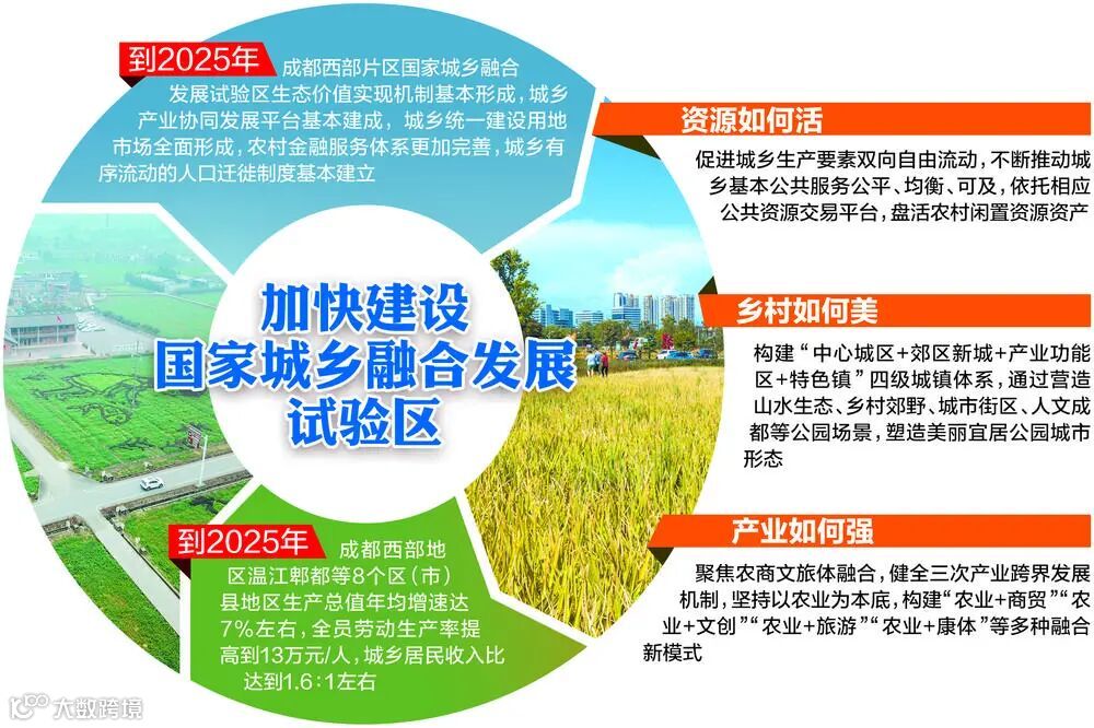 在今年6月出台的《四川成都西部片区国家城乡融合发展试验区实施方案》(以下简称《实施方案》)中,今后一段时期的成都城乡融合有了数字化标准:到2025年,成都西部片区国家城乡融合发展试验区生态价值实现机制基本形成,城乡产业协同发展平台基本建成,城乡统一建设用地市场全面形成,农村金融服务体系更加完善,城乡有序流动的人口迁徙制度基本建立。成都西部地区温江郫都等8个区(市)县2025年地区生产总值年均增速达7%左右,全员劳动生产率提高到13万元/人,城乡居民收入比达到1.6∶1左右,通过探索实践,把试验区建设成为长江经济带生态价值转化先行区、美丽宜居公园城市典范区、农商文旅体融合发展示范区、城乡融合发展改革系统集成区。