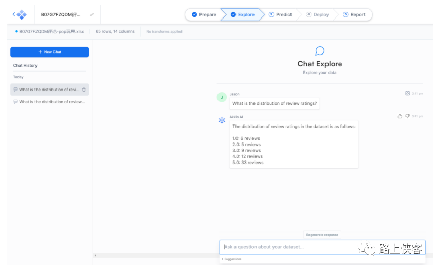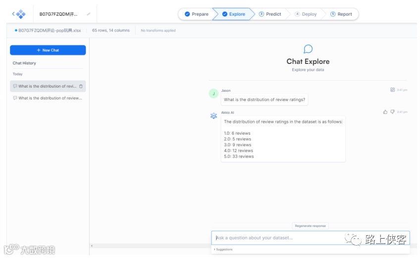可以和akkio ai chat进行分析交互。问及这款产品的物流评分如何?AI立马给到了统计数据,从次数据看来这款产品在物流配送方面的表现和客户满意度还是很高的。