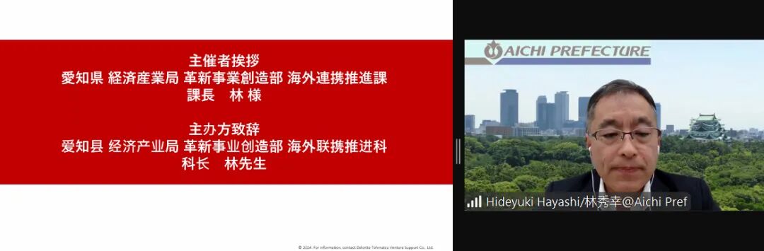 在活动开始时,爱知县经济产业局革新事业创作部海外连携推进科林秀幸科长发表了致辞。他指出,爱知县政府已与海外9个国家和22个地区的创业支援机构、大学等建立了广泛的合作关系,尤其是与中国的深度合作。在此背景下,爱知县与清华大学、启迪控股、上海交通大学和浙江大学等知名机构携手推进“爱知中国创新计划”项目,通过今天与启迪共同举办的路演活动旨在促进中日企业在技术创新和商业合作领域的深度交流,推动构建爱知县的生态系统。