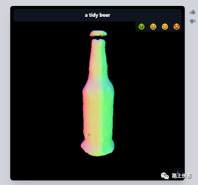 它很快思考完就给到了这个3D图片(画面中是动态在旋转的,然后瓶子的各个角度的表面形状有些不同且颜色也是不一样的)。