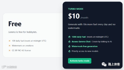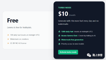 看下费用。免费版本是每天给到100个积分额度,制作的作品中有水印添加,付费版本每个月10美金,可以每天给到1000个积分,可以进行机器人对话,可以去除广告水印,优先使用最新的模型等权益。