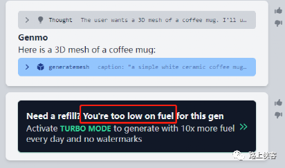 我们试下这个3D图片的制作功能。输入一个简单的描述:a coffe mug 一个咖啡杯。看看它能做出什么来。可能之前是测试了很多视频生成的关系(我之前已做了很多短视频),这个3D的制作就直接说我积分不够了(Fuel)需要选套餐了。