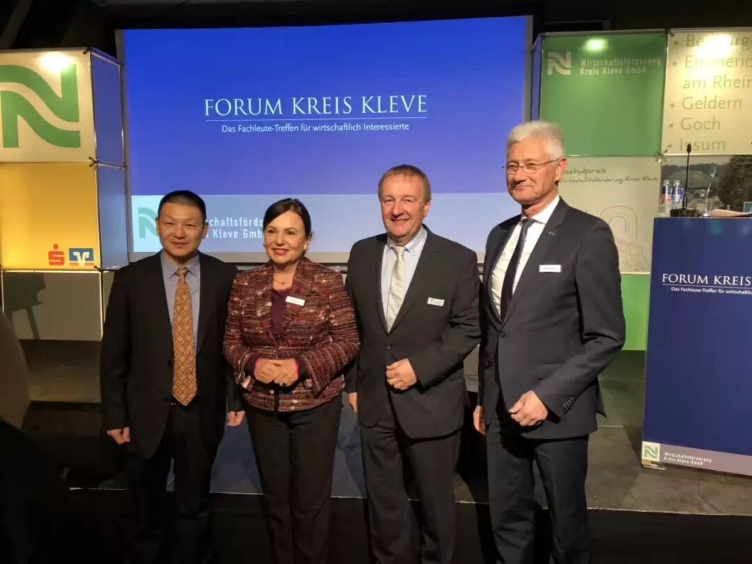 在Kleve地区经济论坛上合影,左起“智汇国际”总裁叶洛华,北威州投资促进署华珮署长,Kleve地区投资促进局局长Hans-Josef Kuypers, Kleve区长Wolgang Spreen.