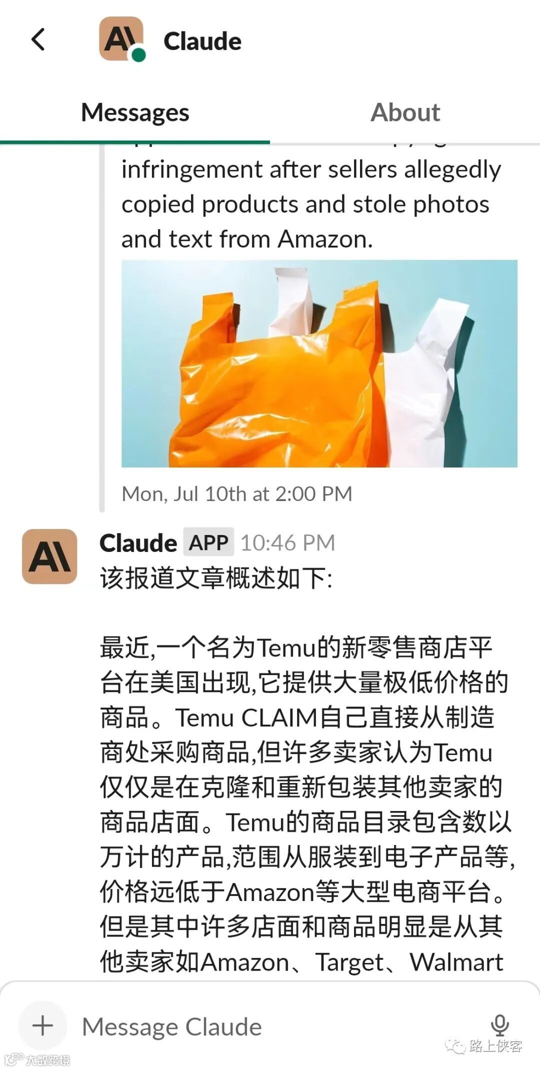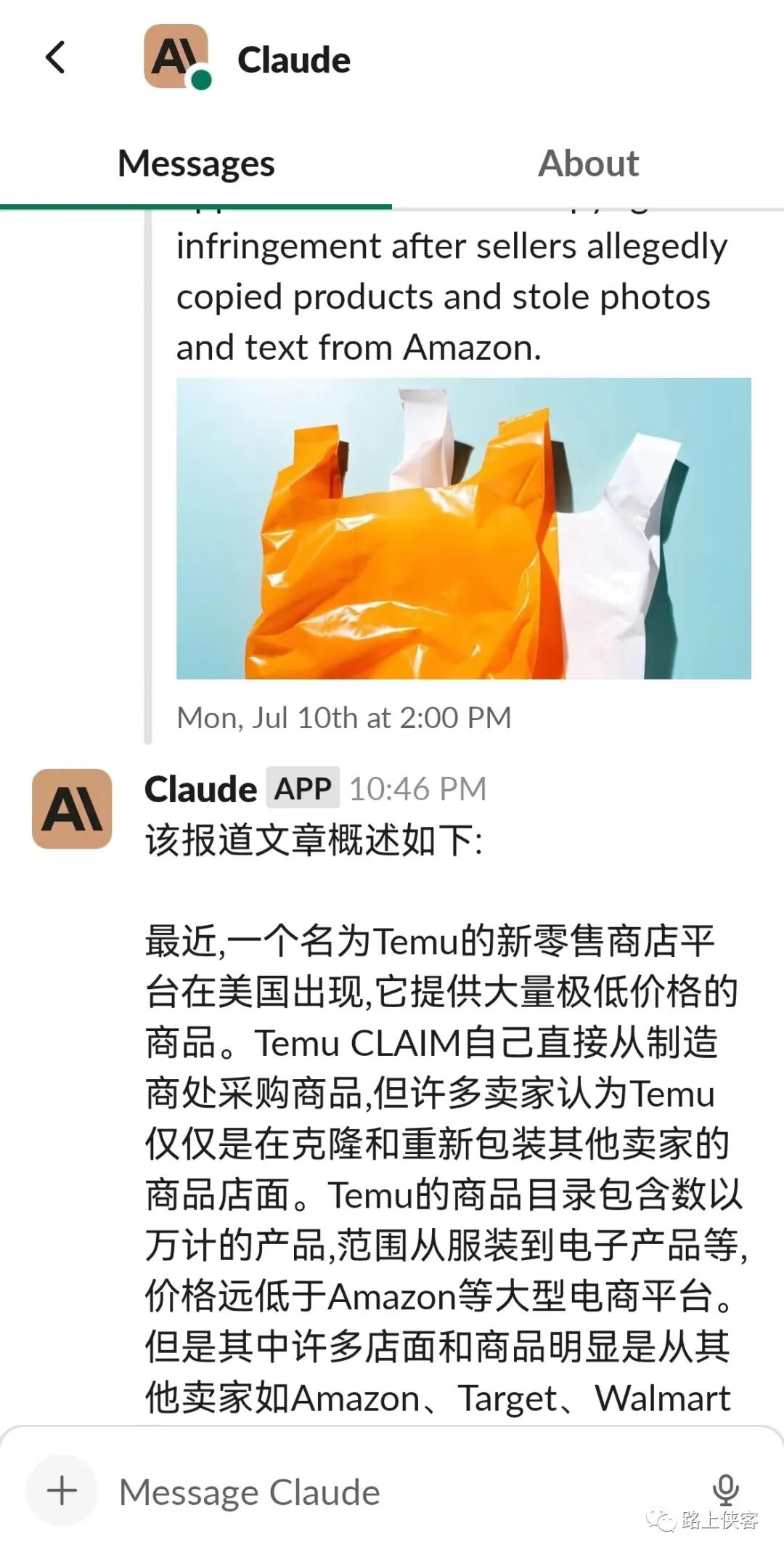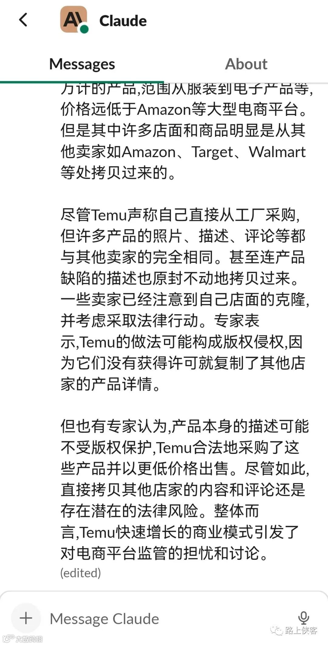 Claude甚至把原报道中的图片都提取出来了。分析上除了主要的前因后果,还多了一些Temu目前的一些现状和平台操作方式,如低价竞争其他电商平台等。感觉在文字内容提炼分析能力上Claude更上一层。