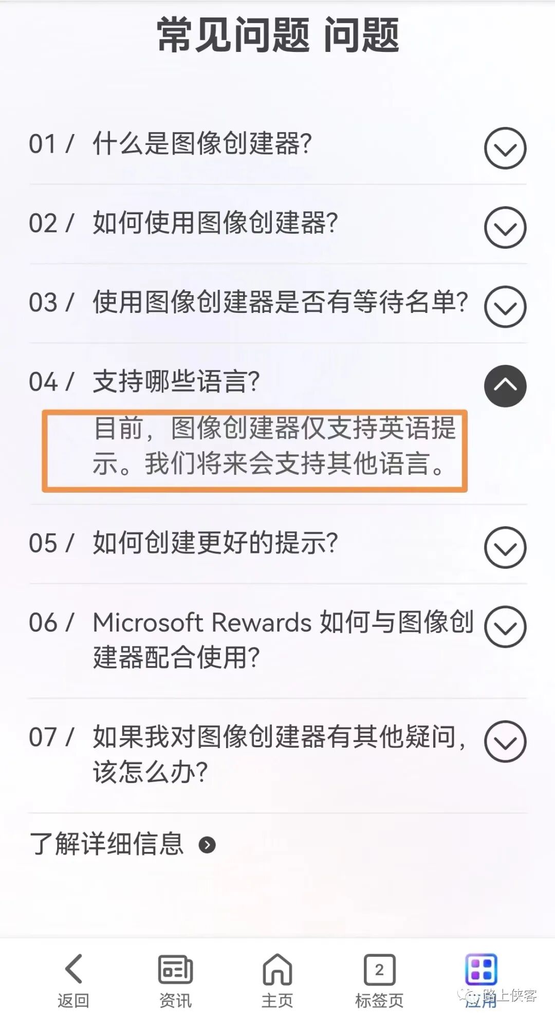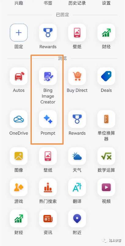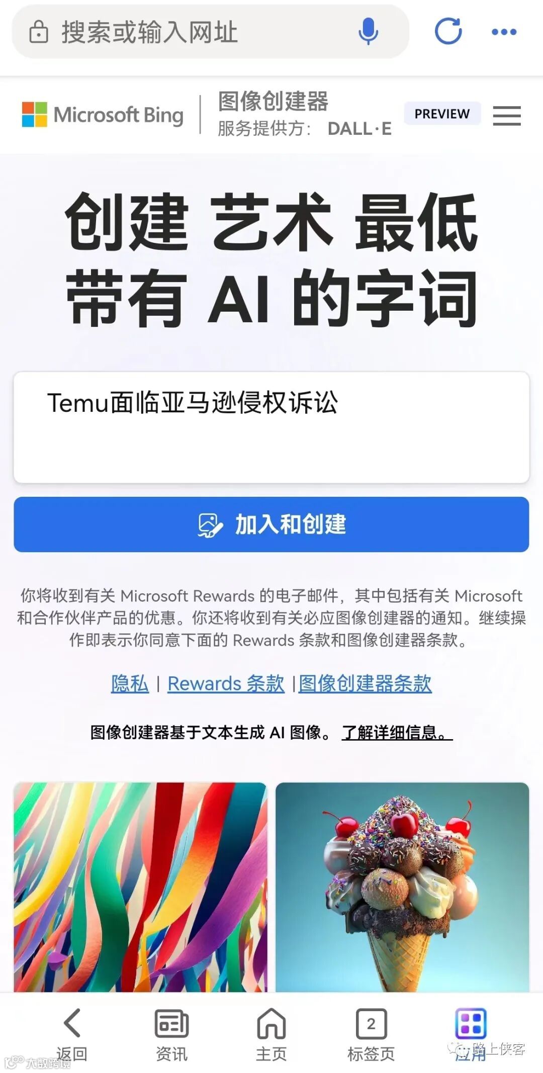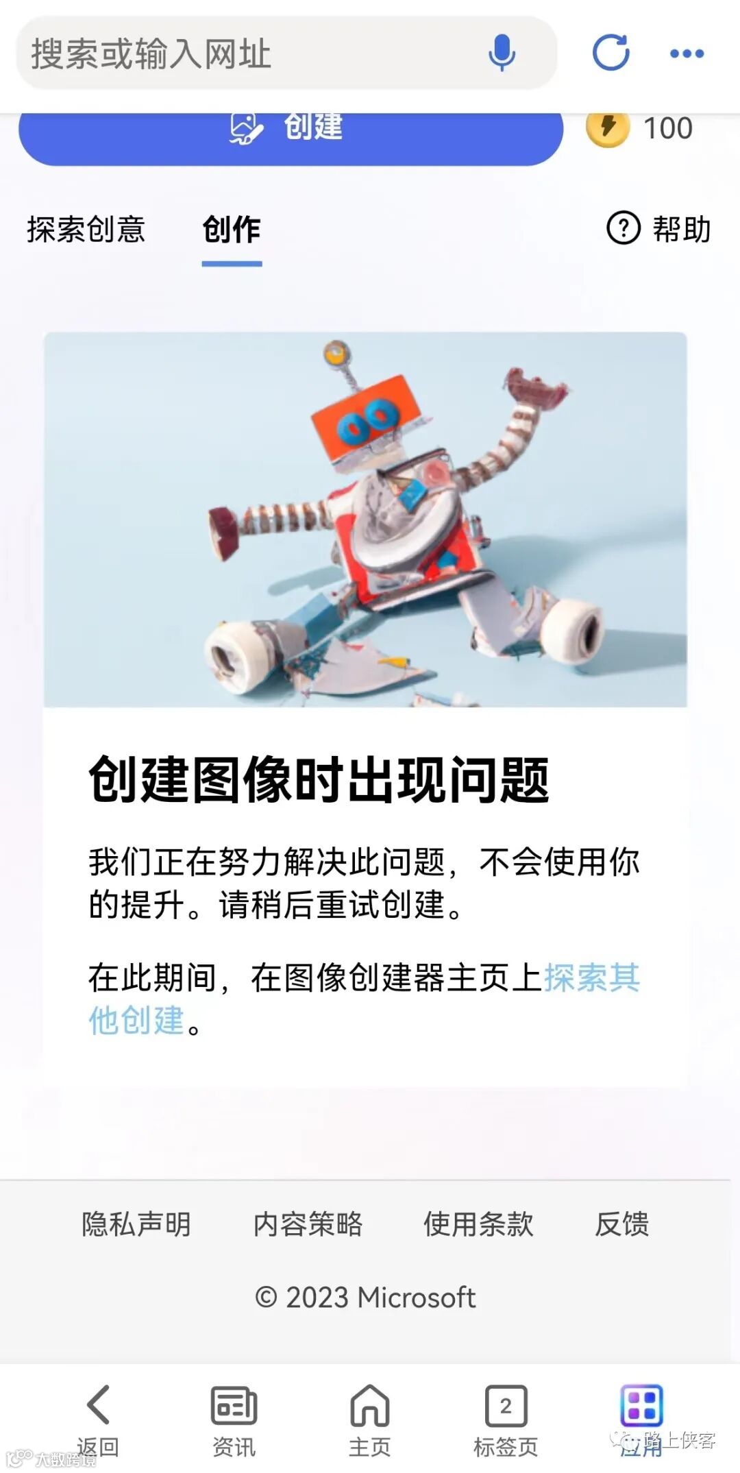 Bing APP的chat功能暂时还用不上,那再看看其他和AI相关的功能吧。Bing的AI绘图器(这个之前也用过,具体可以参考下这篇路上侠客的文章:https://articles.zsxq.com/id_b88g69eof05v.html,文章中提到的国内Bing Chat的镜像目前对方服务器由于被墙已关闭。)