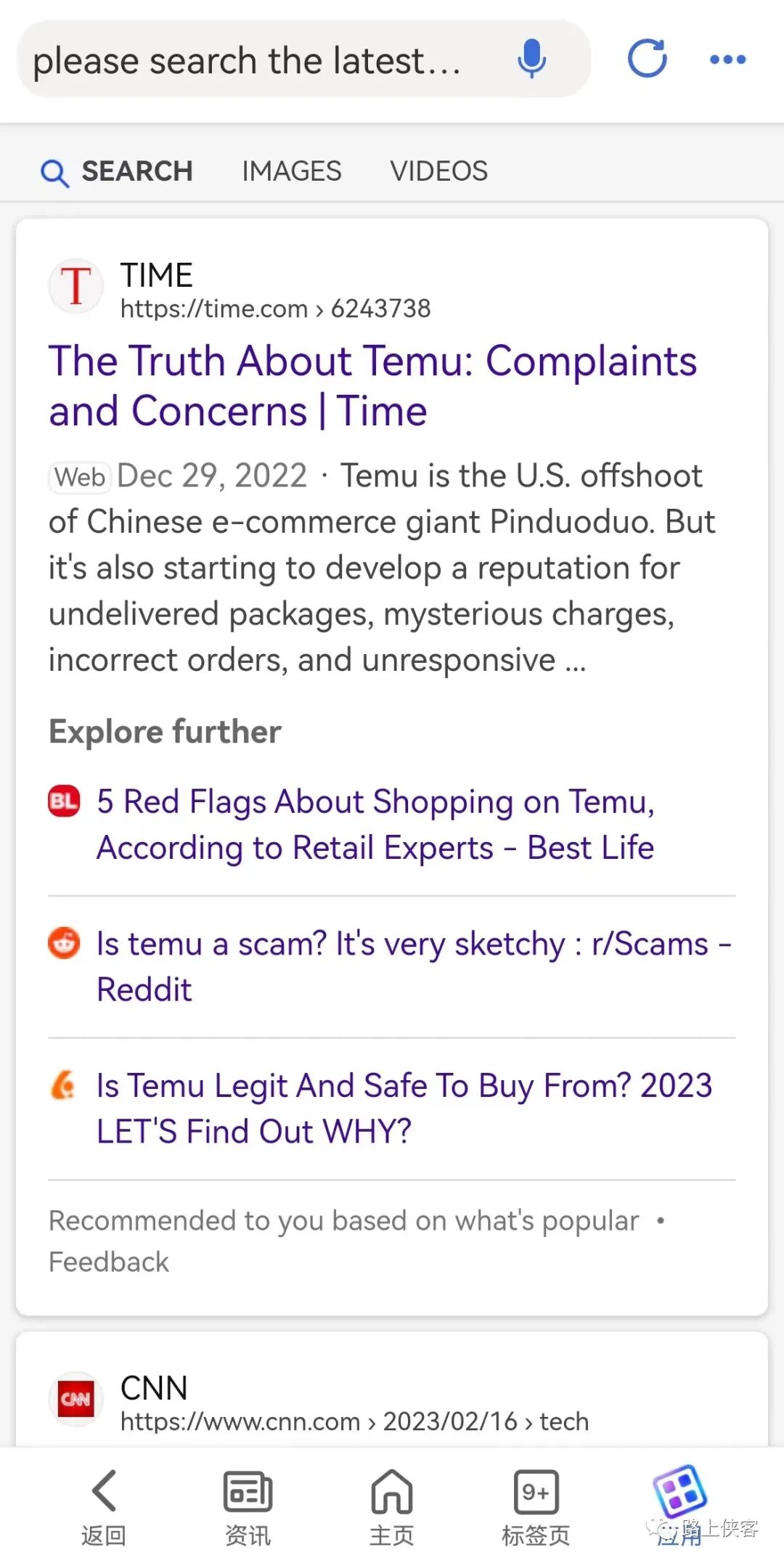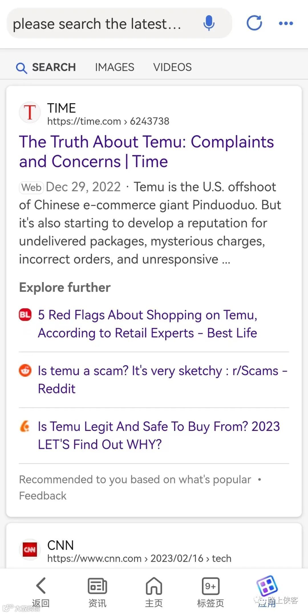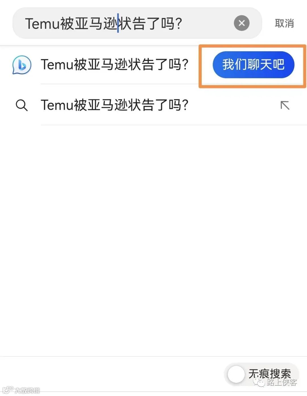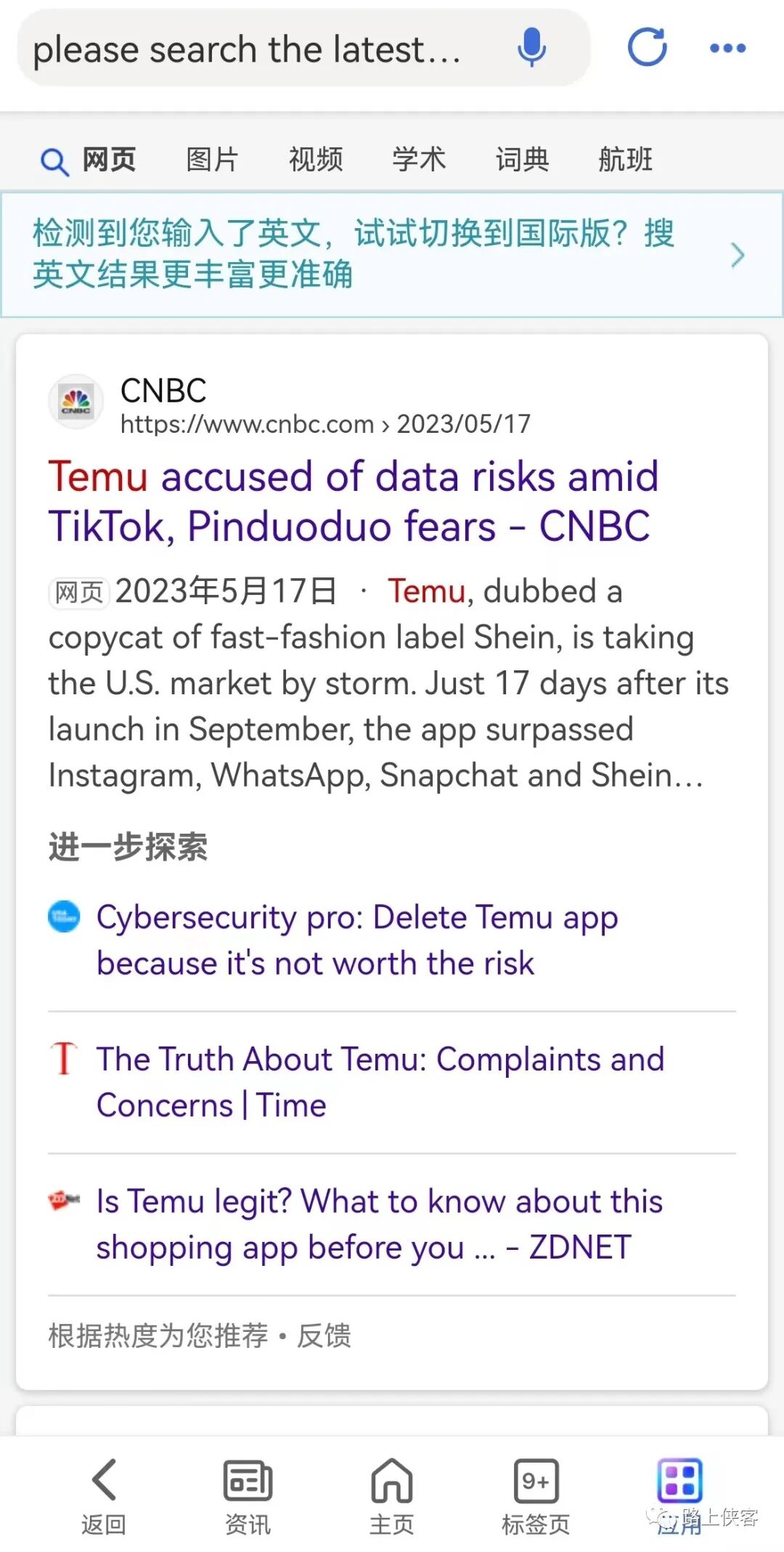 看了这个聊天功能我暂时还用不上(估计是中国区用户的问题,暂时还未开放)。不过这边看搜索结果确实这个Temu侵权被诉的新闻是满头飞啊。