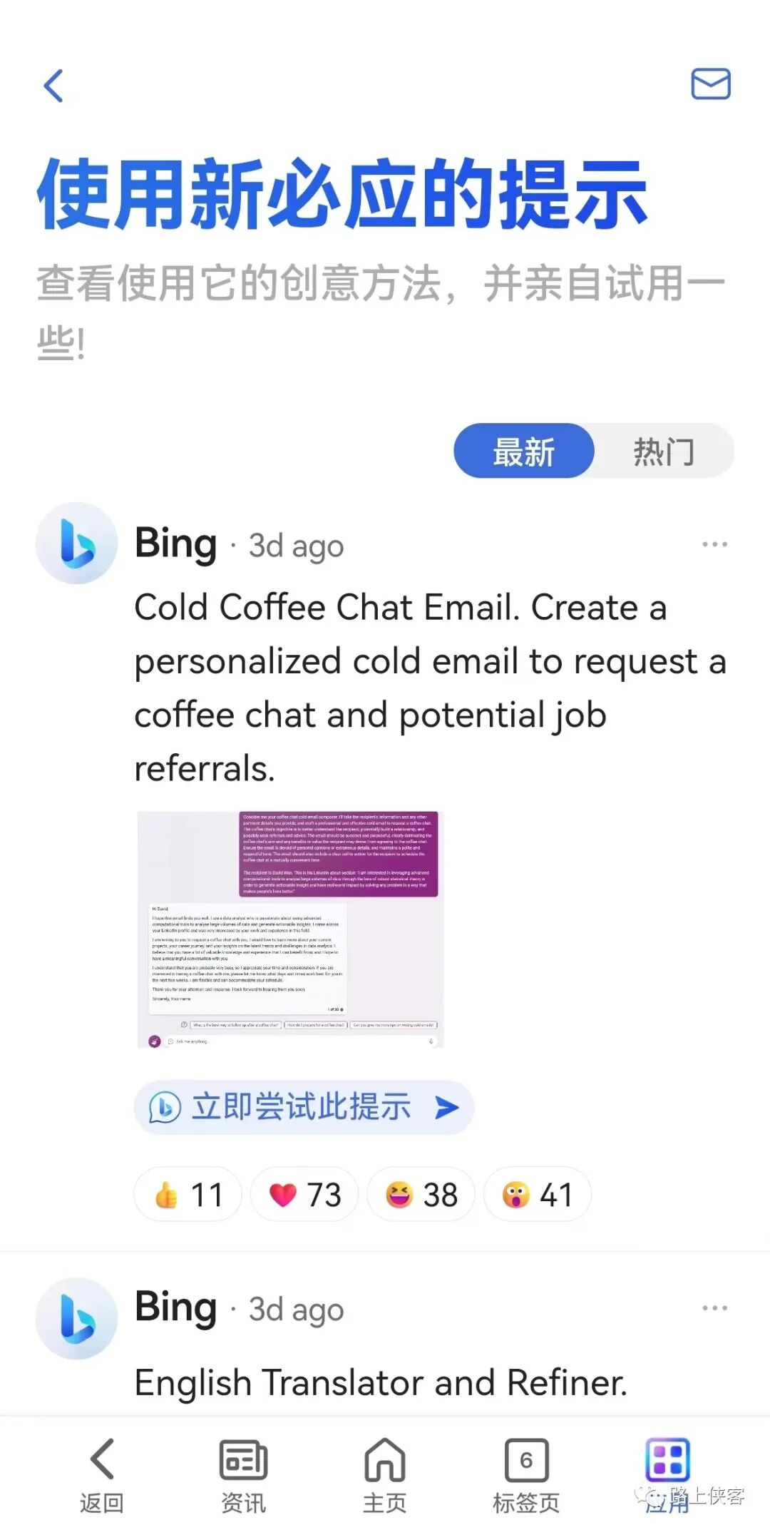 Bing chat会提前推荐一些Prompt,大家可以直接点击试用,也可以看到这个Prompt的热度,点赞数,评论数,喜好数等。有兴趣的小伙伴可以自己体验试试。