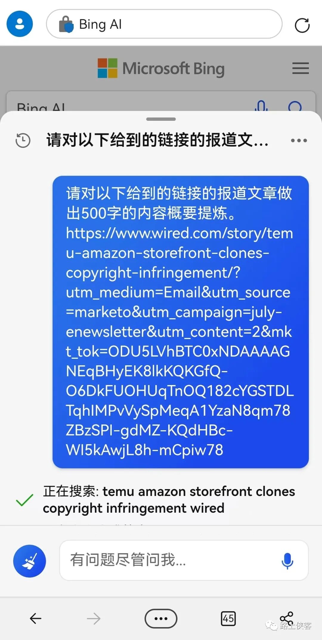 我们用AI来更深了解下这个事件。我们首先使用Bing AI来对这篇报道做一个提炼分析。我们把这边报道的链接附上加上Prompt语句,让它进行文字内容提炼。