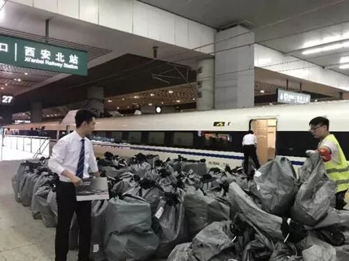 180件商品通过西成高铁当日首趟“动检车”运往西安北站。