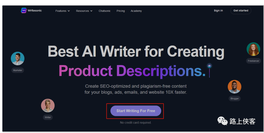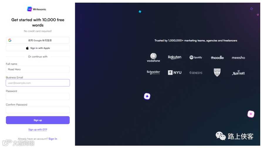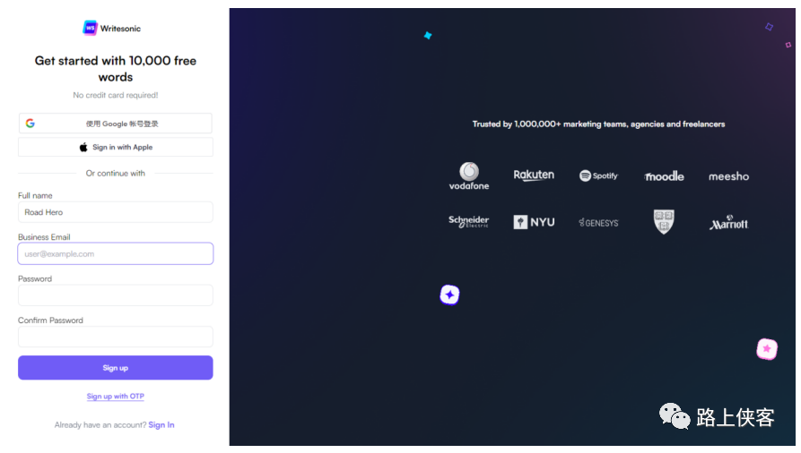 打开注册地址https://writesonic.com/?via=roadhero,点击Start Wrting For Free按钮开始填写注册信息。