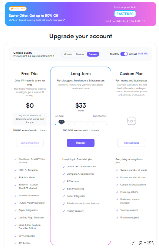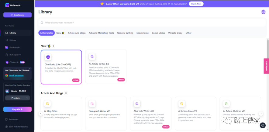 平台提供了初始1万个字的额度供免费试用,AI模型是基于GPT3.5版本。GPT4或是更高版本那就需要订阅它的付费版了。既然有免费的羊毛薅,大家不妨可以先试试。另外,大家对于AI语句指令(Prompt)如果不是很熟悉的话,可以参考下如何使用Writesonic博客上的这篇文章“How to write the perfect ChatGPT prompt and become a ChatGPT expert