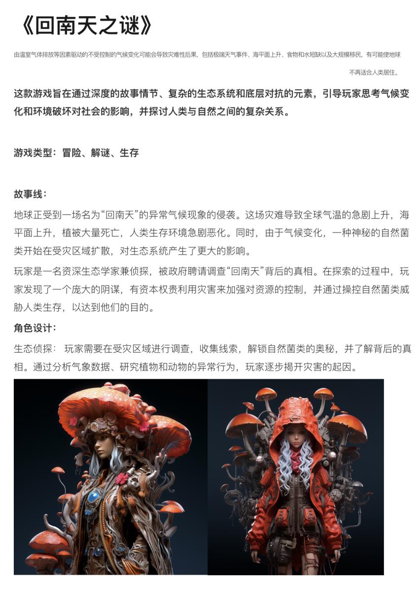 游戏名称叫做回南天之战。这款游戏旨在通过深度的故事情节、复杂的生态系统和底层对抗的元素,引导玩家思考气候变化和环境破坏对社会的影响,并探讨人类与自然之间的复杂关系。地球正受到一场名为“回南天”的异常气候现象的侵袭。这场灾难导致全球气温的急剧上升,海平面上升,植被大量死亡,人类生存环境急剧恶化。同时,由于气候变化,一种神秘的自然菌类开始在受灾区域扩散,对生态系统产生了更大的影响。玩家是一名资深生态学家兼侦探,被政府聘请调查“回南天”背后的真相。在探索的过程中,玩家发现了一个庞大的阴谋,有资本权贵利用灾害来加强对资源的控制,并通过操控自然菌类威胁人类生存,以达到他们的目的。玩家通过收集样本、使用科学仪器和分析数据,深入研究气候变化和自然菌类的影响。这需要在废弃的实验室和被植被覆盖的废墟中进行科学调查。自然菌类控制:玩家掌握一种独特的生态菌类控制技术,可以与自然菌类进行交互,改变其扩散路径,利用其特殊性质解锁新区域,或者与其他生态系统进行协同合作。气候求生策略:玩家需要面对气候灾难带来的挑战,制定生存策略,寻找庇护所,获取资源,并在菌类侵袭和资本权贵的威胁下保持生存。玩家需要管理资源,包括食物、水和避难所,以应对气温激增、海平面上升和自然菌类的威胁。制定策略以建造可持续的生存基地,防范灾害。解谜任务:玩家需要解决环境谜题和生存挑战,同时调查“回南天”现象的起源。谜题可能涉及使用科技设备、分析气象模式,以及破解政府文件。社交互动:玩家与其他存活者互动,可能建立联盟或对抗敌对派系。选择与其他角色分享知识,合作解决问题,或者保留信息以获取更大的优势。虚拟现实元素:游戏支持虚拟现实设备,使玩家能够沉浸式地体验末世环境。玩家可以通过虚拟现实眼镜查看植被覆盖的废墟、观察自然菌类的生长,以及进行科学实验。多重结局:玩家的决策将影响游戏的进展和结局。游戏可能有多个结局,取决于玩家的选择,这激励玩家多次尝试以发现所有的故事线索和结局。游戏设置五个环节来最终完成。