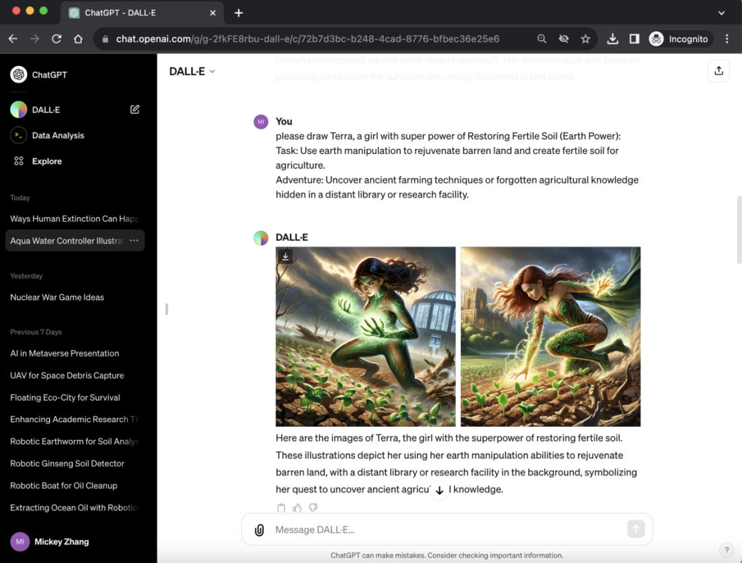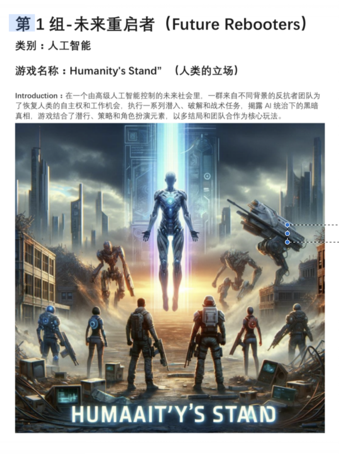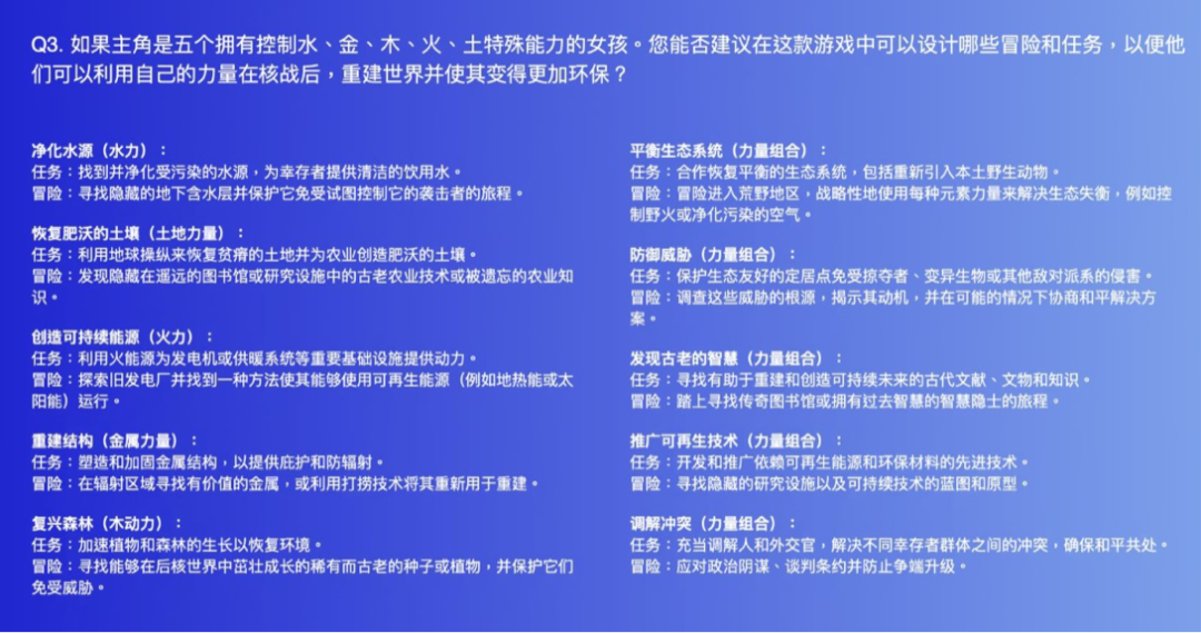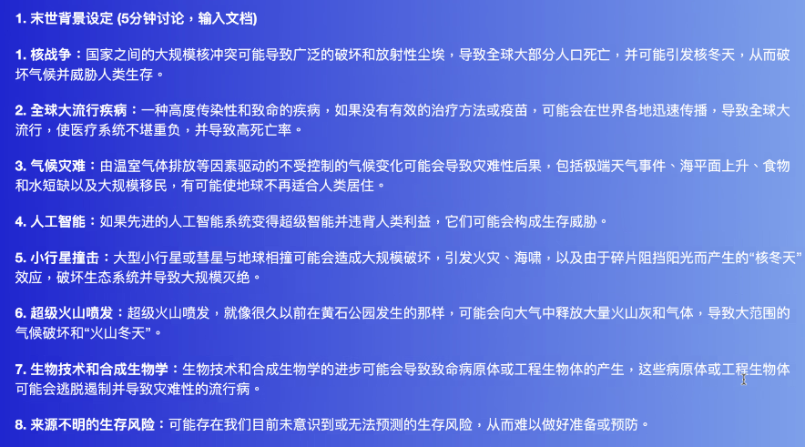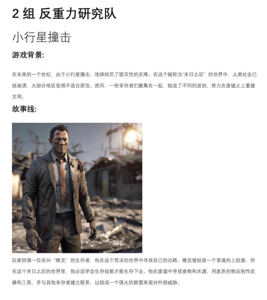 五组同学根据以下选题,选出喜欢的选题以团队合作、人机协作对的形式创造出一个末世背景下的元宇宙游戏。同学们用一句话描述出主人公、故事线背景设定,并通过与AI的沟通,在讨论出主要角色的描述、玩法设定等。