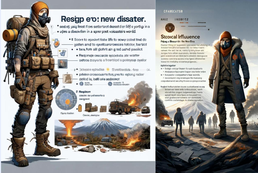 角色都展示了潜行和秘密行动的技能。角色的设计是为了有效地融入后世界末日的环境,服装和装备适合伪装和安静的运动。他们的外表反映了他们在一个正在自我重建和更新的世界中适应和生存的能力。每个角色都代表了灾后世界的希望与重生的主题,注重与环境的融合,以求安全。