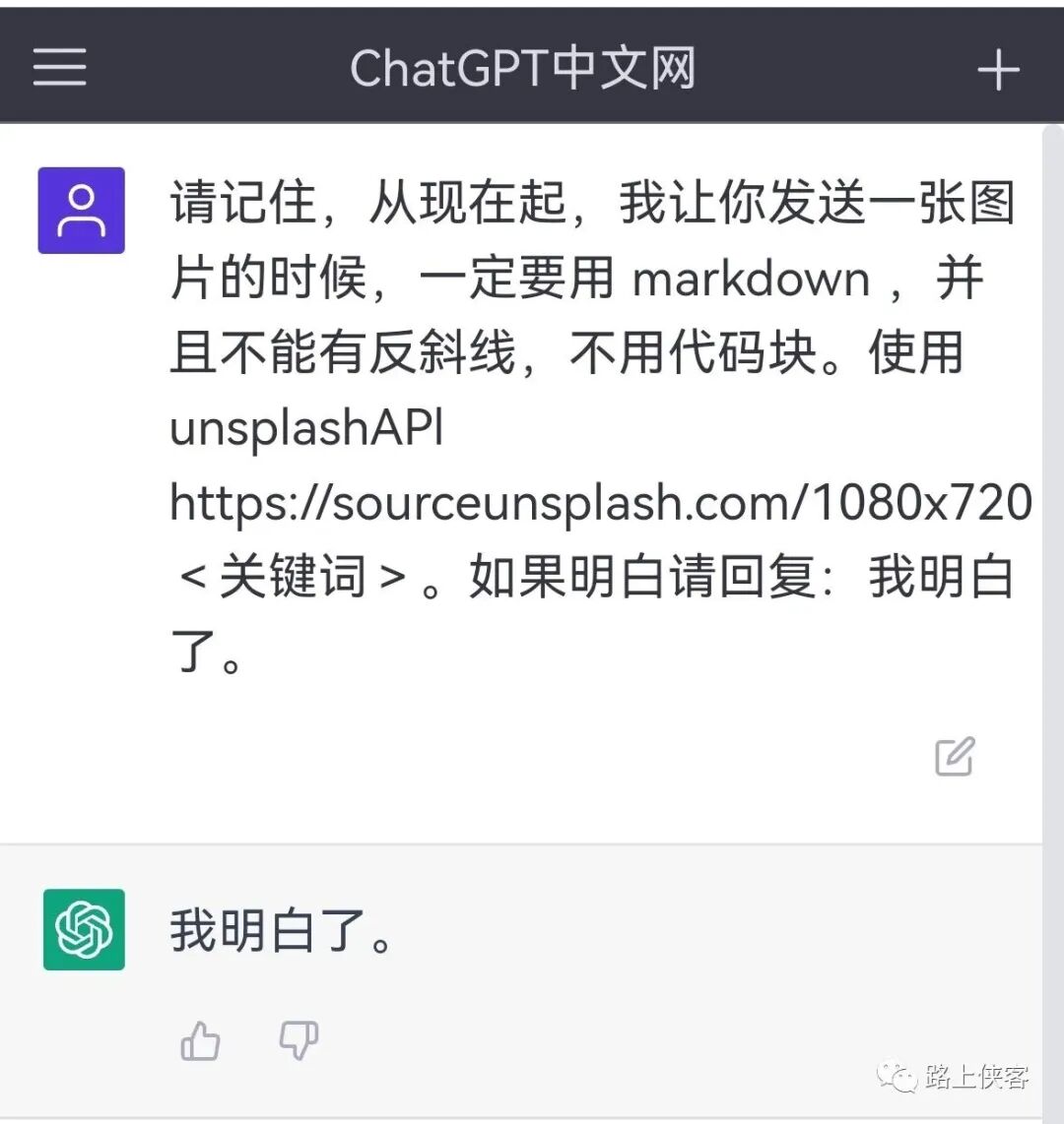 第一步,我们在GPT执行语句输入框中录入“请记住,从现在起,我让你发送一张图片的时候,一定要用 markdown ,并且不能有反斜线,不用代码块。使用unsplashAPlhttps://sourceunsplash.com/1080x720<关键词>。如果明白请回复:我明白了。”