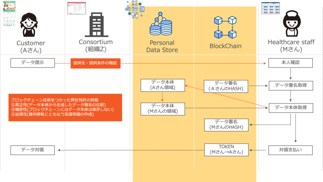 区块链技术的分布式明细中只存储签名数据; 通过数据的权利转移明细防止不正当的信息利用。