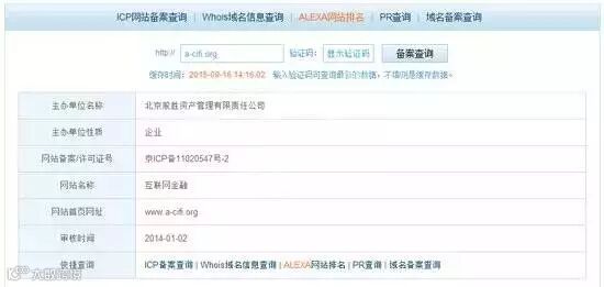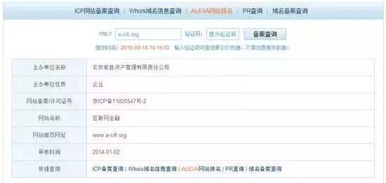 笔者对其域名(http://www.a-cifi.org/index.asp)进行了查询(如下图),发现其主办单位名称为“北京股胜资产管理有限责任公司”。也就是说,“中国互联网金融行业协会”只是一家私人公司自己组建的草台班子。一家这样的公司真的能承担起推动中国互联网金融发展的作用吗?