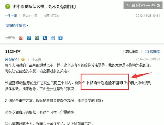 这种方法最常见的方法是软文推广,例如:百度搜索“老中医祛痘怎么样,会不会有副作用”,可以看到其中有个答复。