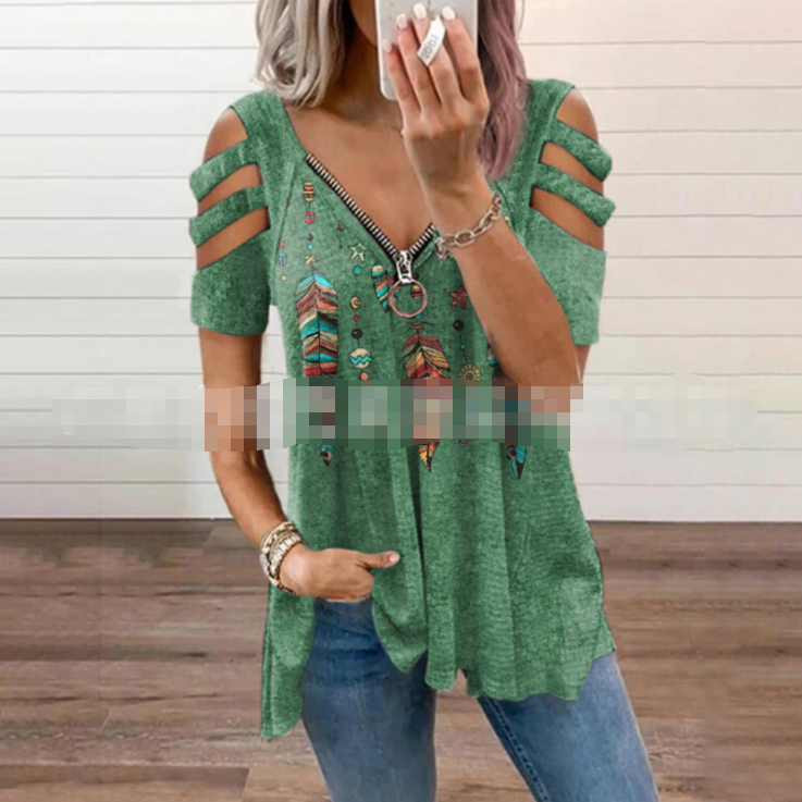 标题:Womens Summer Clothing Casual Off Shoulder Short Sleeved Tops Deep V-neck Zipper Blouses Ladies Fashion Printing T-shirt Loose Plus Size Shirts