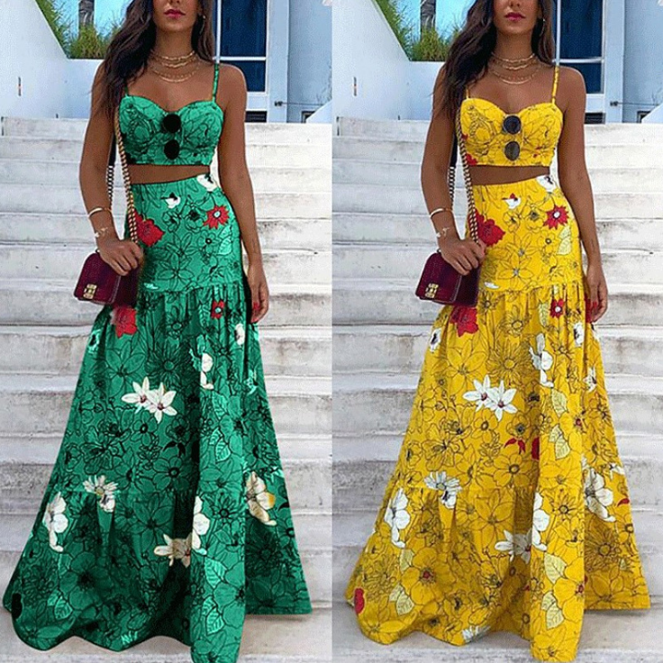 产品名称:欧美女装长裙2021春季 跨境新款印花性感裹胸吊带连衣裙