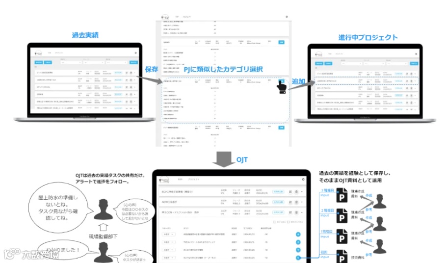 建筑行业的人力资源短缺,快速培养行业人才是当前的迫切课题。通过使用该系统,将业务流程及任务内容输入系统并建成数据库。通过数据库,可以在开展新项目的同时实现人员培训。数据作为“经验资产”在系统中永久存储,将归属于特定个人的经验转化为共享知识。建筑行业人员可以在退休后通过该系统分享经验,新员工可以通过借此迅速提高工作效率。