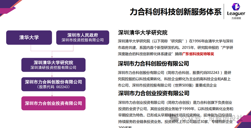 1996年,由清华大学与深圳市政府共同发起,深圳清华大学研究院正式成立。深圳市力合科创股份有限公司(简称力合科创,股票代码002243)是深圳清华大学研究院控股的以科技成果转化、科技企业孵化为主业的高科技企业和A股上市公司,深圳市投资控股有限公司(世界500强)重要成员企业。力合科创累计孵化服务企业4000多家,投资高科技企业近500家,在创投圈声名远播。