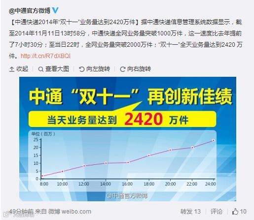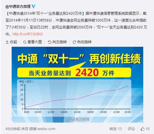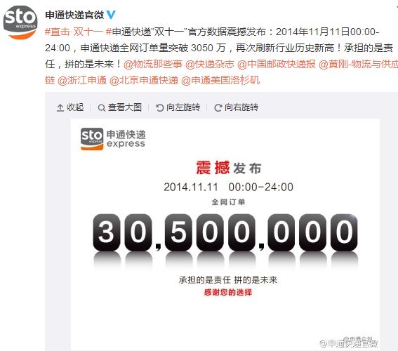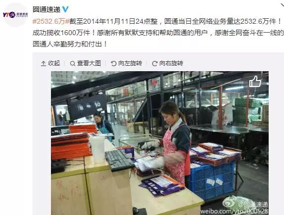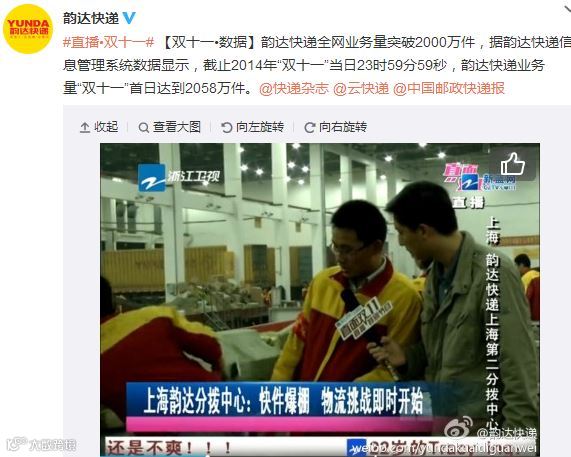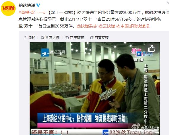 据部分快递公司官方宣布数据,11月11日当天,申通、圆通、中通和韵达等四家快递公司全网业务量均突破2000件。以下为具体数据报道: