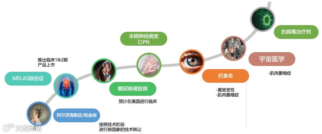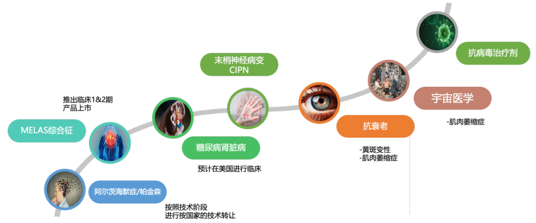 多疾病适应症:针对多种线粒体功能异常疾病,包括阿尔茨海默症(AD)、帕金森病(PD)、化疗引起的末梢神经病变(CIPN)、MELAS综合征、糖尿病肾脏病(DKD)、皮肤皱纹、HSV1和HSV2等。