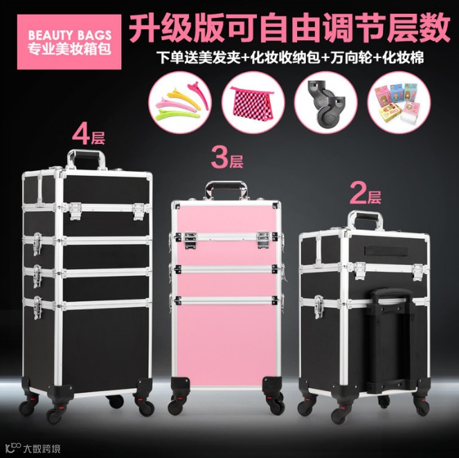 产品名称:铝合金拉杆化妆箱 万向轮多层化妆拉杆箱 可拆纹绣美发美甲工具箱