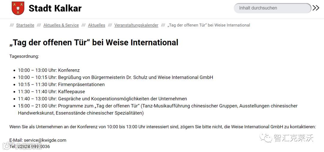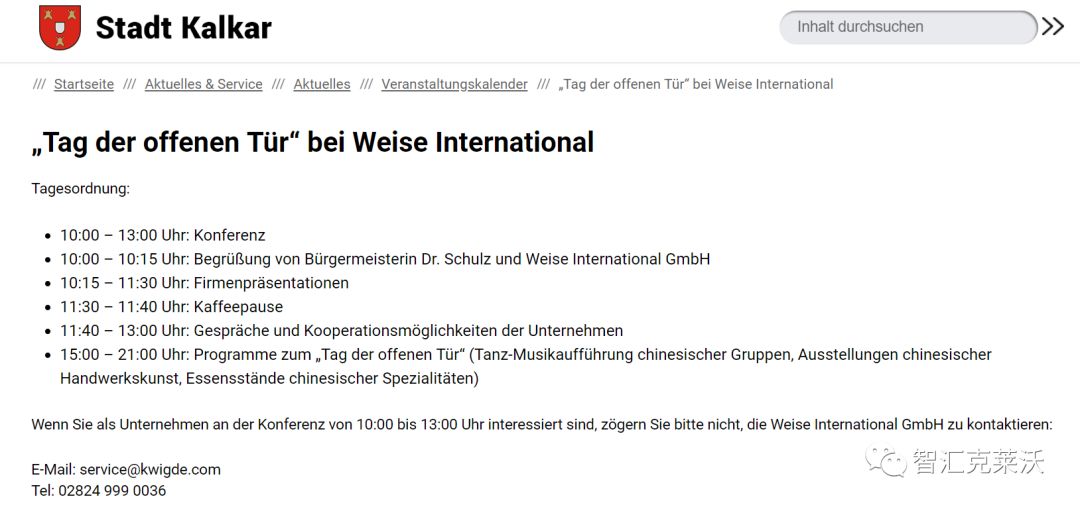 经Kreis Kleve经济促进局、Kalkar市政府和智汇国际商量确定,我们将于2019年8月16日在“中德·智汇城”举办“首届中德经济文化交流开放日”。