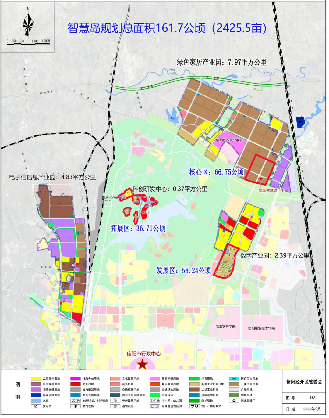信阳智慧岛位于信阳市中心城区,总规划面积2425.5亩,选址东起新二十四大街、西至京广铁路,北起工业大道、南至信茶大道。立足“三空间二平台一示范”功能定位及“三区五链一高地”的发展布局,按照先导核心区、赋能发展区、整合拓展区三个片区梯次建设。